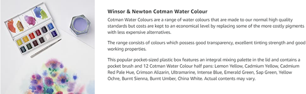 Winsor & Newton Cotman Water Colors are a range of water colors that are made to our normal high quality standards but costs are kept to an economical level by replacing some of the more costly pigments with less expensive alternatives. Each color has good transparency, excellent tinting strength and good working properties. This exclusive compact Field Box has been designed to be light-weight and fit snugly into the pocket while providing everything required for successful outdoor water color painting. Constructed in durable blue plastic, the Field Box includes: 12 Cotman Water Color half pans, a pocket brush, artists' sponge, 3 mixing areas, 35ml capacity water bottle, clip-on water container and an instructional leaflet. Colors included: Cadmium Red Pale Hue, Cadmium Yellow Hue, Cadmium Yellow Pale Hue, Alizarin Crimson Hue, Ultramarine, Cobalt Blue Hue, Sap Green, Viridian Hue, Burnt Umber, Yellow Ochre, Burnt Sienna and Chinese White.