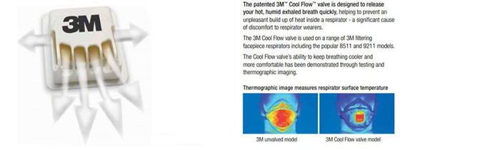 - 3M COOL FLOW EXHALATION VALVE: Reduces heat build-up inside the respirator. Making it suitable for work situations involving heat, humidity, or long periods of wear.