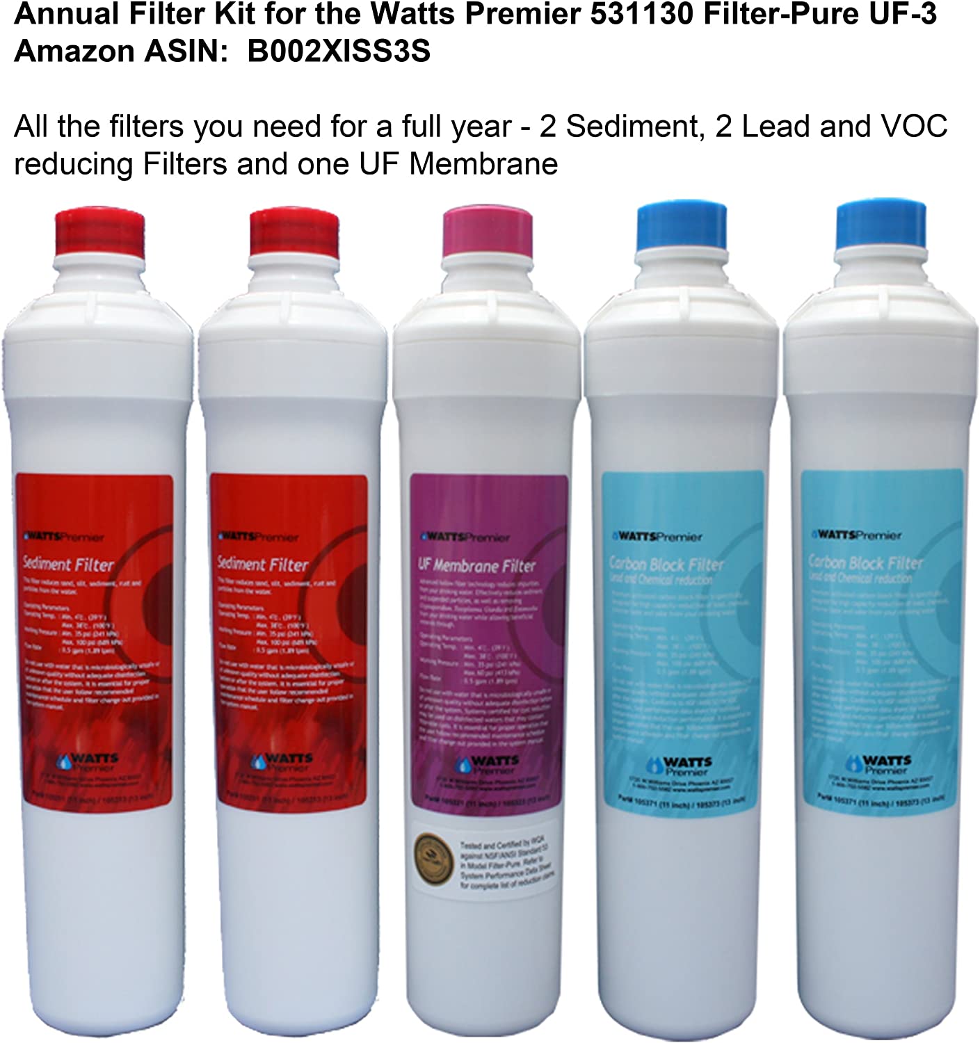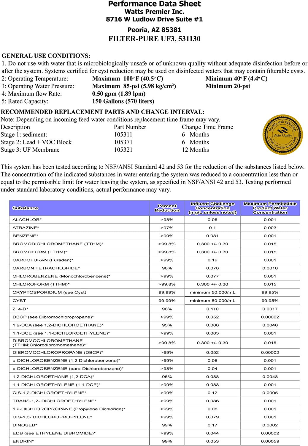 The Watts Premier Filter-Pure UF-3 Water Filtration Device is backed by a three-year limited warranty.