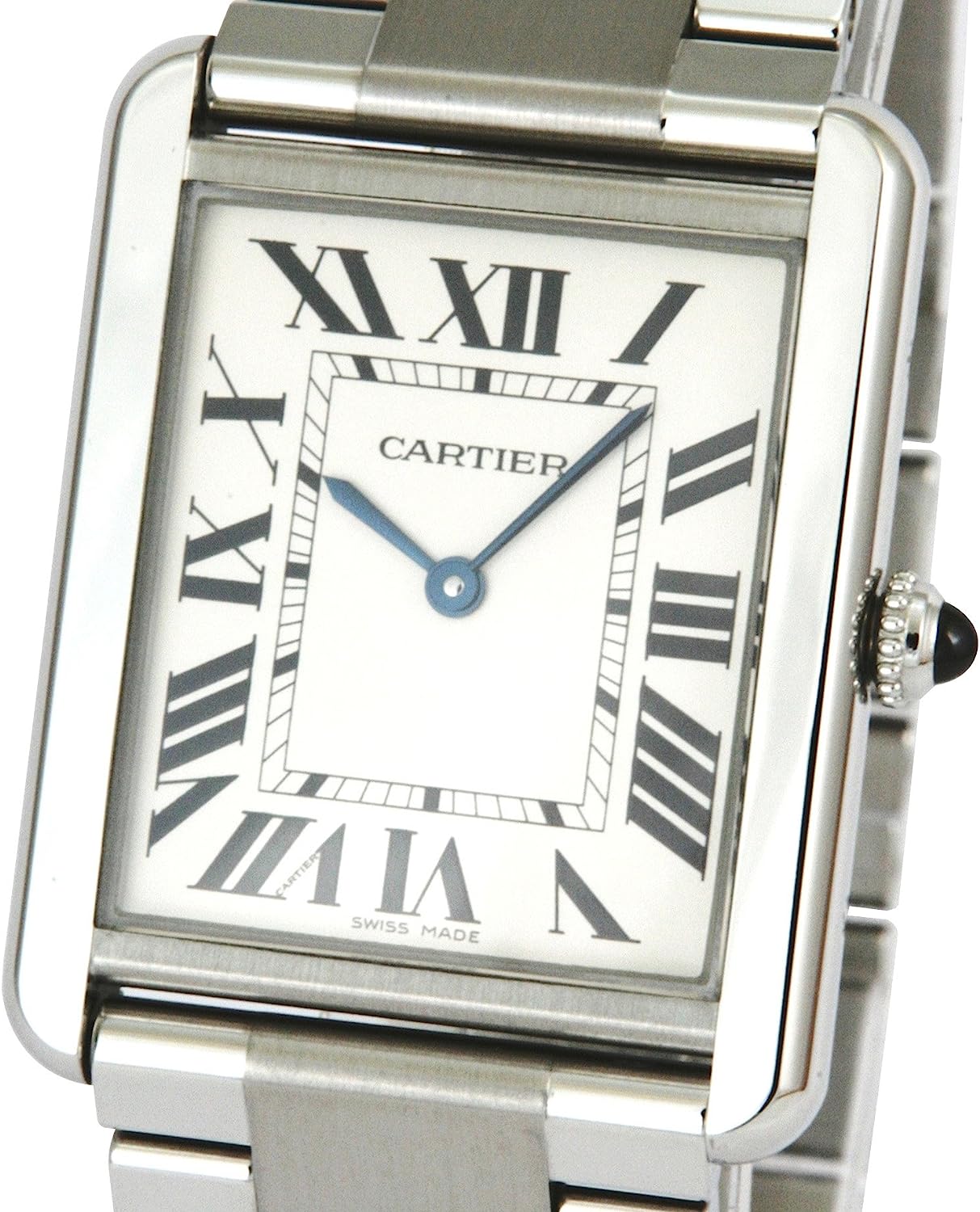 Square watch featuring logoed silver dial with sword-shaped blue hands and Roman numeral markers