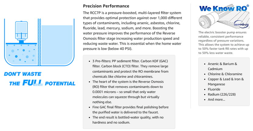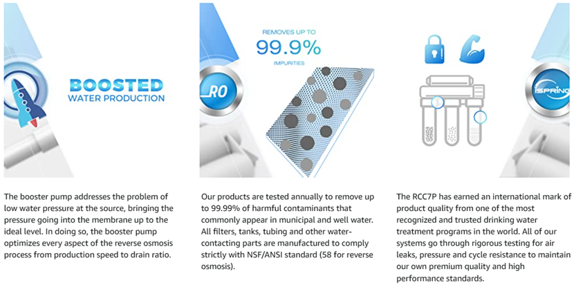 • Reverse Osmosis produces purified drinking water by pressurizing water molecules through RO membrane and leaving impurities out. The under sink water filter RCC7P’s extremely durable electric booster pump ensures high efficiency, reliable, and consistent RO system performance regardless of pressure variations; delivering higher throughput with less waste water in comparing to pump less models.