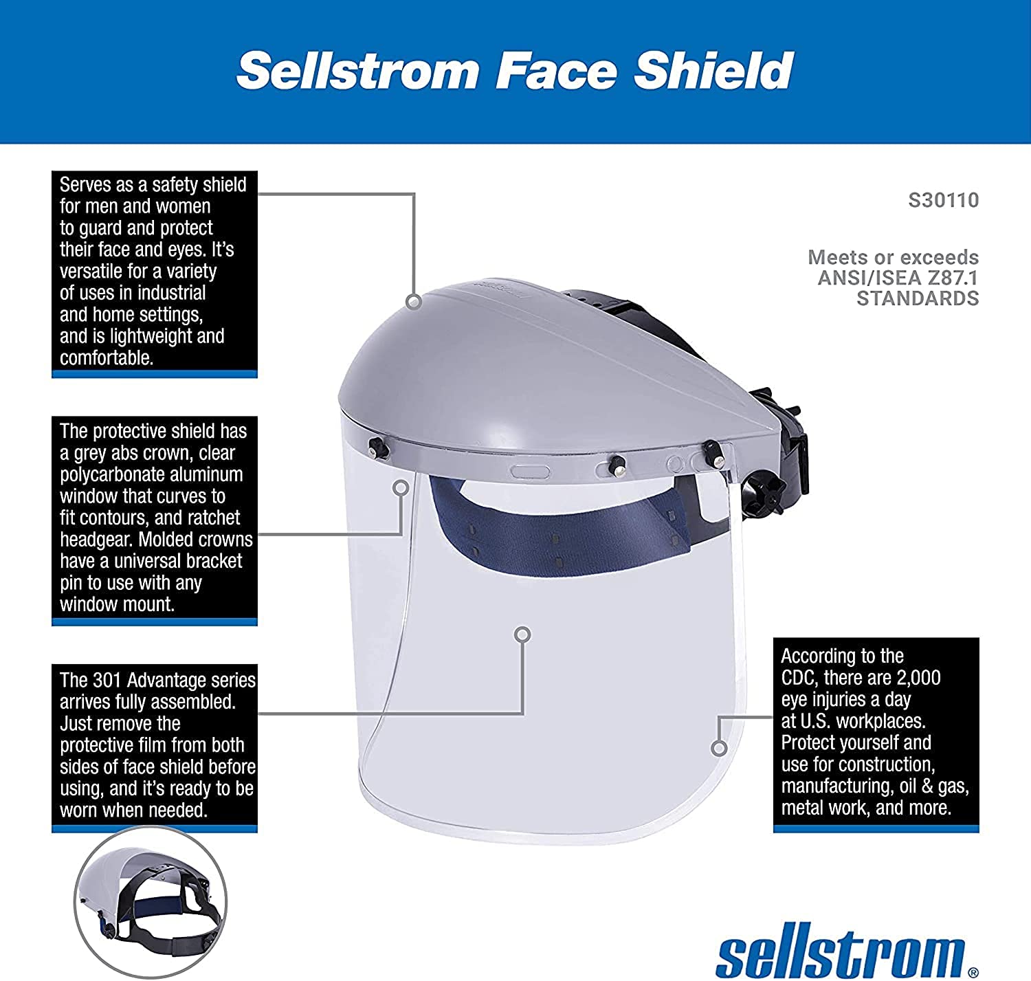 NO ASSEMBLY NEEDED: The 301 Advantage series arrives fully assembled. Just remove the protective film from both sides of face shield before using