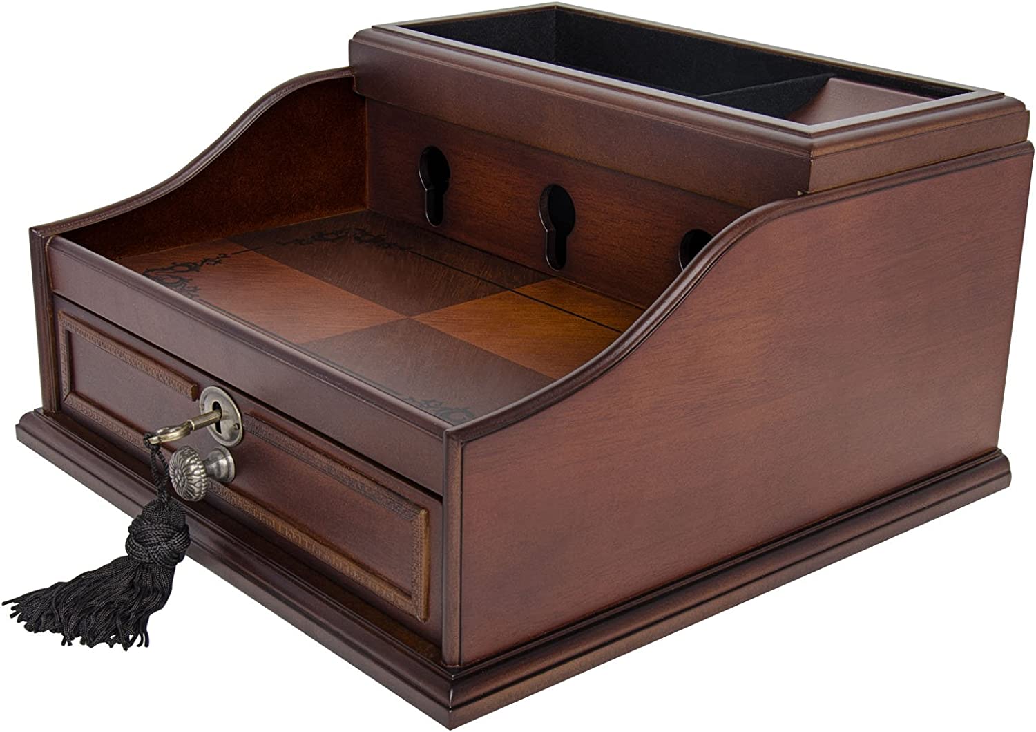 Upper Tray for Daily Essential Items, Additional pull-out drawer below with lock to protect your valuables and a back compartment for organizing charging cables.