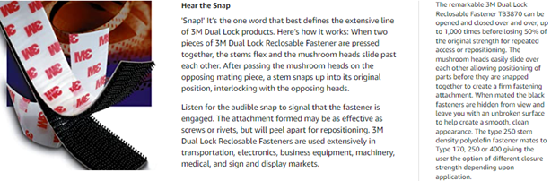 3M Dual Lock Reclosable Fasteners are used extensively in transportation, electronics, business equipment, machinery, medical, and sign and display markets They are ideal for both indoor and outdoor applications including, attaching signs, cushions, enclosure and access panels, banners, doors, adjustable shelving, vehicle ceiling panels, furniture seats and backs, and much more As a general rule, four square inches of fastener area per pound of static tensile or shear load to be supported (4in2 and lb) is suggested as a starting point for evaluation More or less area may be needed depending on specific conditions or end use applications Do not use too much of the reclosable fastener or it will be extremely challenging to separate the two parts Pry off with a screwdriver if necessary Customer is solely responsible for evaluating the product and determining whether it is appropriate and suitable for customer’s application