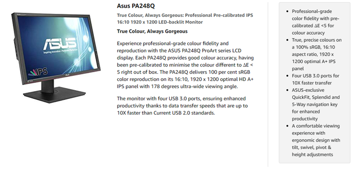 Experience professional-grade color accuracy and reproduction with the ASUS PA248Q ProArt display featuring 16:10, 1920 x 1200 HD A+ IPS panel for 178 Degree ultra-wide viewing angle. Each PA248Q is factory pre-calibrated to 100% sRGB color with color differential of ∆E < 5 right out of box