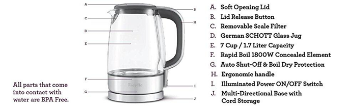 The Breville BKE595XL Crystal Clear Electric Kettle ensures a more pure boil using the natural purity of glass.