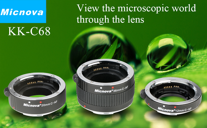 The KK-C68 Extension tubes are designed to enable a lens to focus closer than its normal set minimum focusing distance. Getting closer has the effect of magnifying your subject (making it appear larger in the viewfinder and in your pictures). They are exceptionally useful for macro photography, enabling you to convert almost any lens into a macro lens at a fraction of the cost while maintaining its original optical quality. This Autofocus Extension Tube Set (12/20/36mm) for Canon from Micnova contains three tubes of different length, a 12 mm, 20 mm and 36 mm, which can be used individually or in any combination to obtain the desired magnification. (An individual 25mm autofocus extension tube is available).