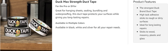 Designed to maximize duct tape’s three interlocking layers, Duck Tape Brand Max Strength Duct Tape has received best-in-class ratings for its strong adhesion and holding power to everything from wood, masonry, plastic and glass. Whether you’re a pro on the construction site or a DIYer in need of something stronger, Max Strength grade tape is both easy to tear and tough enough for all your repair needs. Also great for hanging plastic sheeting, sealing, bundling and waterproofing, this heavy duty duct tape protects your surfaces while giving you long lasting repairs.