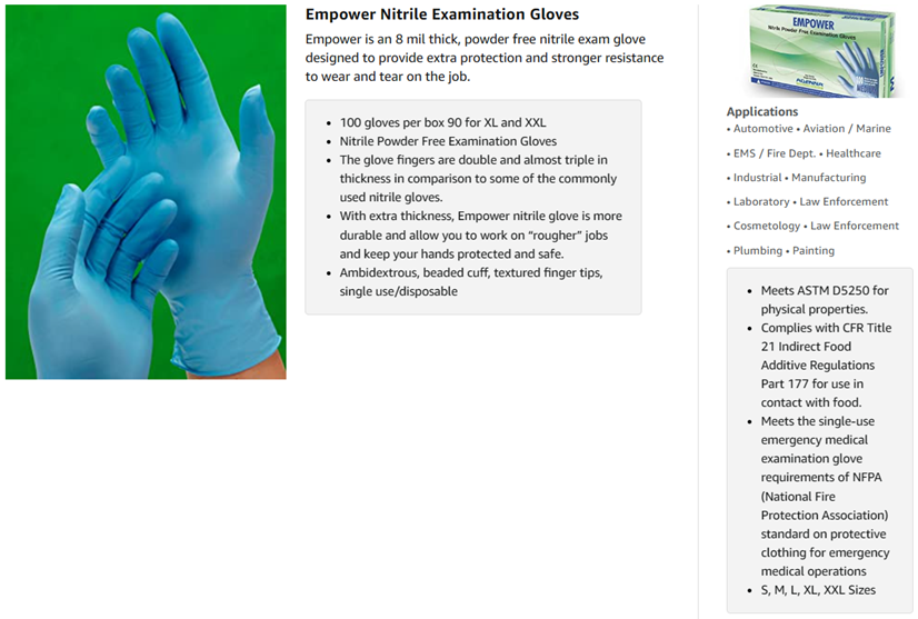Empower is an 8 mil thick, powder free nitrile exam glove designed to provide extra protection and stronger resistance to wear and tear on the job. The glove fingers are double and almost triple in thickness in comparison to some of the commonly used nitrile exam gloves. With extra thickness, Empowerinchesnitrile glove is more durable and allow you to work on “rougher” jobs and keep your hands protected and safe. Though thicker, the glove provides an excellent grip as a result of our advanced production process. It is great for EMS, law enforcement, correctional facilities, laboratory, mid to heavy mechanics and industrial applications. It also meets the single-use emergency medical examination glove requirements of NFPA (National Fire Protection Association) 1999 – 2013 standard on protective clothing for emergency medical operations.