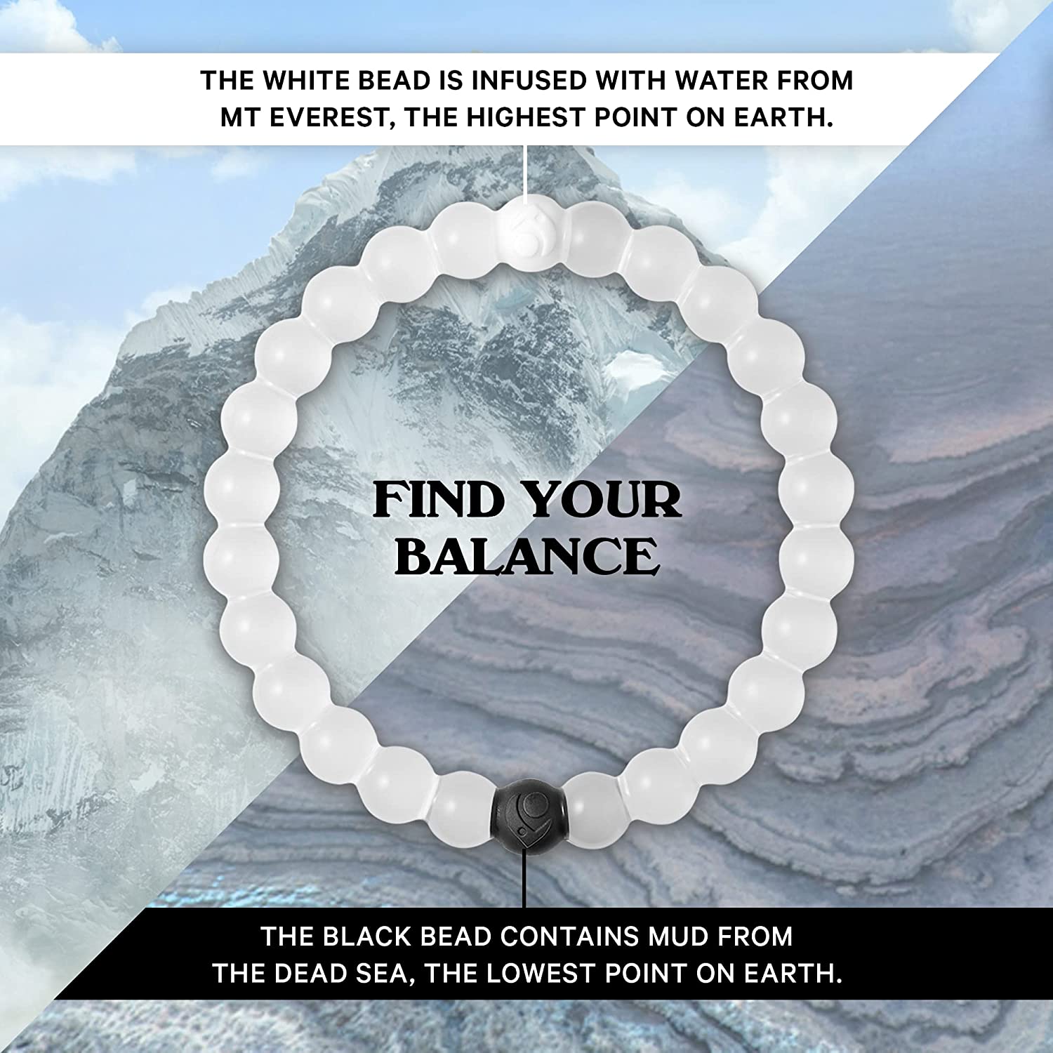 • Find Your Balance: The white bead is infused with water from Mt Everest, the highest point on earth, while the black bead contains mud from the Dead Sea, the lowest point on earth - reminding us to find balance and stay humble during life's highs and hopeful during the lows.