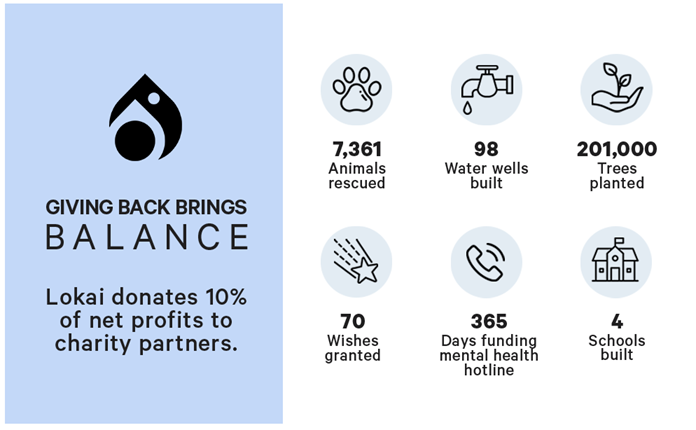• Give Back: We believe giving back brings balance, so Lokai donates 10% of net profits to charity partners.