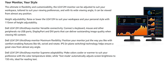 Enjoy widescreen performance, any way you want it. With a 24" 16:10 panel, IPS technology and LED backlight, the U2412HM provides a brilliant view, plus amazing adjustability to suit any style. Your monitor, your style. The ultimate in flexibility and customizability, the U2412HM monitor can be adjusted to suit your workspace, tailored to suit your viewing preferences, and with its wide viewing angle, it can be viewed from almost any position. Designed with the environment in mind. Your workspace isn't the only environment that can benefit from the U2412HM.