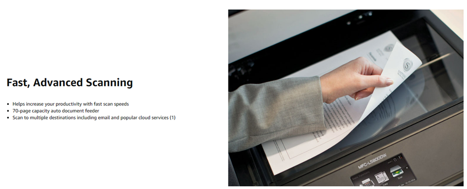 A perfect all-in-one office solution for small to medium-sized businesses, the Brother Business Laser MFC-L5800DW was engineered to help streamline office efficiency. With a print and copy speed of up to 42 pages per minute(2), this high-performance all-in-one produces professional-looking reports, spreadsheets, and other important documents with crystal-clear precision and accuracy. This Brother Business Laser All-in-One is a small office printer, copier, scanner, and fax machine that offers simultaneous operation (meaning that you can scan and print simultaneously). Also, a built-in automatic duplex printing function permits you to print on both sides of the paper, helping save money and resources. The MFCL5800DW multifunction printer offers multiple types of connectivity with Ethernet and wireless interfaces and mobile device printing and scanning support for most smartphones and tablets. (3) The easily navigated 3. 7-inch color touchscreen offers the option of creating up to 48 customized shortcuts for frequently used functions. Users can also scan to or print from popular business cloud services directly from the 3. 7-inch touchscreen display without using a computer via Evernote, Google Drive, Dropbox, and more. (1) This Brother all-in-one offers a 70-page capacity automatic document feeder for copying and scanning multi-page documents. The adjustable 250-sheet capacity paper tray and 50-sheet capacity multipurpose tray make printing and copying simple. This printer can be upgraded to a 1, 340-sheet total capacity with optional trays. The MFC-L5800DW is also Dash Replenishment enabled. This system allows the printer to measure the toner level of your Genuine Brother Replacement Cartridges and automatically order replacements. This ensures you never run out of toner so that you can maintain the office efficiency you expect and require. (1)Requires an Internet connection and an account with desired service. (2)Based on one-sided printing. Change from default setting required. (3)Requires connection to a wireless network. (4)Approximate toner cartridge yield in accordance with ISO/IEC 19752 (letter/A4).