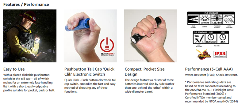 Special Features‎Drop Resistant, 200 Lumens, Compact, Pocket Size Design, Batteries Included, Powerful Projecting LED Beam, Pushbutton tailcap switch