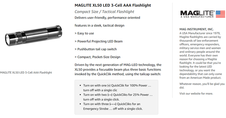 Introducing the Maglite XL50 3-cell AAA LED flashlight. The Maglite LED XL50 flashlight, with its compact, pocket-size design and adjustable LED spot-to-flood beam, features a rear push-button tail cap switch coupled with three modes: high power, 25% energy save power, and emergency strobe. This flashlight has an impact-resistant and durable aluminum casing that helps keep it protected. With Intelligent Energy Source Management, the brightness and effective power usage is continuously monitored, allowing for prolonged battery life. Uses three AAA alkaline batteries (included).