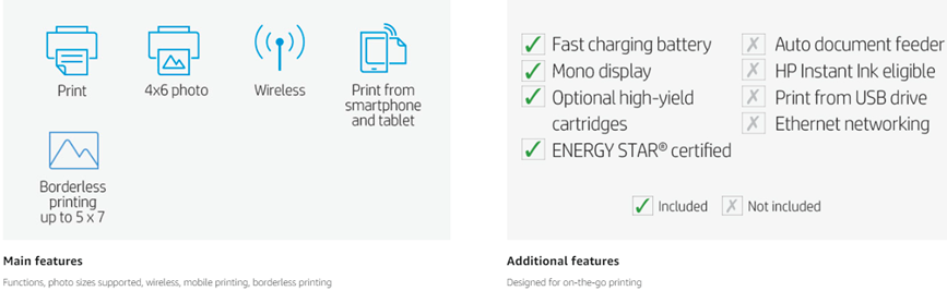 Make the world your office with powerful portable printing—no network necessary. This quick, quiet printer delivers more pages per cartridge and has a long- lasting battery life. Ideal for mobile professionals and telecommuters who need a high-quality, reliable, portable printer they can take virtually anywhere. Easy portable printing wherever you need it: Simply print from your laptop or mobile devices wirelessly, with or without a router. This durable, compact printer fits in your car, backpack, and more, for convenient printing anywhere. Start printing in minutes. HP Auto Wireless Connect makes setup easy. Lead the way with fast, easy mobile printing. Reduce charging interruptions with a long-lasting battery. Stay productive with a large and easy-to-use control panel. Set the pace for success wherever you go. Keep moving through the day with fast print speeds. Get the highest page yields of any other in-class printer, using Original HP cartridges. High-powered quality and reliability: Power through the workday. Charge from home, in your car or office, and more. Get high-quality prints time after time with a printer designed and built to be reliable. Minimize disruptions with premium design and quiet performance. Impress clients, without noisy interruptions. Plug in your AC power source to charge within 90 minutes while the printer is off, with HP Fast Charge.