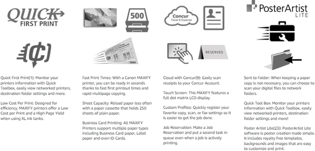 | 1. Document print speeds are the averages of ESAT in Office Category Test for the default simplex mode, ISO/IEC 24734. Document print speeds are the averages of FPOT in Office Category Test for the default simplex mode, ISO/IEC17629:2014. Print speed may vary. During successive printing, the printer may slow down the operation to prevent the internal temperature from rising. depending on system configuration, interface, software, document complexity, print mode, page coverage, type of paper used etc. Copy speeds are the average of sFCOT and sESAT, ISO/IEC 29183. Copy speed may vary depending on document complexity, copy mode, page coverage, type of paper used etc. and does not take into account warming up time. When scanning or copying a certain volume of documents (approx. 150 sheets in default settings) continuously from the ADF,the printer may switch to 'waiting mode' in which paper feeding stops for several tens of seconds after each scan to prohibit overheating the ADF. See the websitefor additional details. 2. Duty Cycle is defined as the maximum number of printed pages for a single peak month. 3. Requires an Internet connection and the Canon PRINT Inkjet/SELPHY app, available for free on the App Store and at Google Play. Compatible with iPad, iPhone 3GS or later, and iPod touch 3rd generation or later devices running iOS 7.0 or later, and Android mobile devices running Android 2.3.3 or later. Your device must be connected to the same working network with wireless 802.11 b/g/n capability as your printer. For users of compatible Apple mobile devices, document printing requires Apple AirPrint, which requires an AirPrint-enabled printer connected to the same network as your iOS device. A printer connected to the USB port of your Mac, PC, AirPort Base station, or Time Capsule is not supported. 4. AirPrint functionality requires an iPad, iPhone 3GS or later, or iPod touch 3rd generation or later device running iOS 4.2 or later, and an AirPrint-enabled printer connected to the same network as your iOS device. A printer connected to the USB port of your Mac, PC, AirPort Base station, or Time Capsule is not supported. 5. Requires an Internet connection and Google account. Subject to Google Terms of Service. Certain exceptions may apply. | 6. Requires Android mobile device with Android 4.4 operating system or later with the Mopria Print Service pre-loaded with that device and the compatible PIXMA/MAXIFY printer on the same wireless network. The Mopria experience is also available on Android 4.4 mobile devices with a download of the Mopria Print Service from Google Play. 7. Wireless printing requires a working network with wireless 802.11b/g or n capability. Wireless performance may vary based on terrain and distance between the printer and wireless network clients. 8. Resolution may vary based on printer driver setting. Color ink droplets can be placed with a horizontal pitch of 1/600 inch at minimum. 9. Scan to Concur requires a valid Concur account. Scanned files have a 10MB volume limit, with a 100 page maximum. Multiscan not available, receipts uploaded to Concur Cloud. 10. Optical resolution is a measure of maximum hardware sampling resolution, based on ISO 14473 standard. 11. The Public Switched Telephone Network currently supports fax modem speeds of 28.8 Kbps or lower, depending on telephone line conditions. Sending and receiving fax machines need to conform to ITU-T v.34 guidelines. 12. Black and white document fax transmission speed is based on default setting using ITU-T No.1 chart. Color document fax transmission speed is based on default setting using Canon Color Fax Test Sheet. Actual transmission speed varies depending on document complexity, fax setting at receiving end, and line conditions etc. 13. Page count is based on ITU-T No.1 chart or Canon FAX Standard Chart No.1. The number of pages able to be kept in memory will vary based on remaining memory capacity and document complexity. 14. High Page Yield calculated when using Canon Genuine XL Ink Tanks. 15. Requires an Internet connection.16. Acoustic Noise is measured based on ISO7779 standard. | 17. Operation can only be guaranteed on a PC with factory-installed Windows 10, Windows 8.1, Windows 8, Windows 7, Windows Vista or XP. 18. Available from printer driver and fax driver only. XPS drive is not supported for Windows Server 2003 and 2003 R2. 19. Internet Connection required during software installation. 20. Some functions may not be available with these Operating Systems. Please refer to the manual or our website for full details. 21. Requires a Windows RT compatible device with Windows 10, Windows 8.1 or Windows 8 and the Canon Easy-PhotoPrint app for Windows RT available for free in the Windows Store. 22. PosterArtist Lite software v2.60.00 is compatible with 64/32 bit versions of Microsoft Windows 10, Windows 8.1, Windows 8, Windows 7 and Windows Vista, and only compatible with Canon PIXMA (released after July 2015), MAXIFY, imagePROGRAF and Océ printers. Minimum computer system requirements: Pentium4 2.4Ghz CPU or higher with 1GB RAM, 1024x768 pixel display and 5GB of system hard drive space. 23. Warranty programs are subject to certain conditions and restrictions. See the website for details. 24. Dimensions with letter (A4) paper installed. |