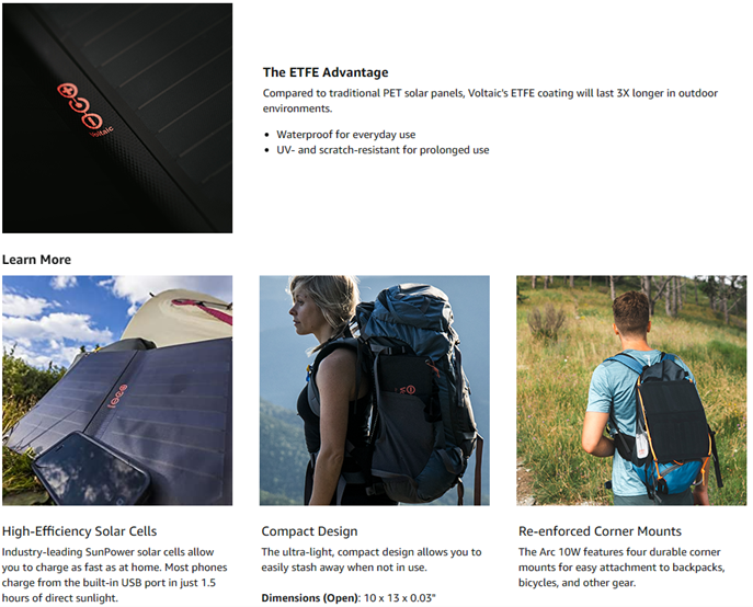 • TOUGH IN THE SUN - HIGH QUALITY, TESTED MATERIALS | The waterproof, UV, and scratch-resistant coating is built to last and go wherever you go. The 10 Watts / 5V folding panel uses ETFE coating instead of PET to last outside at least 3x longer than competitors’ products (5+ years)