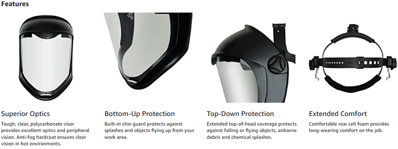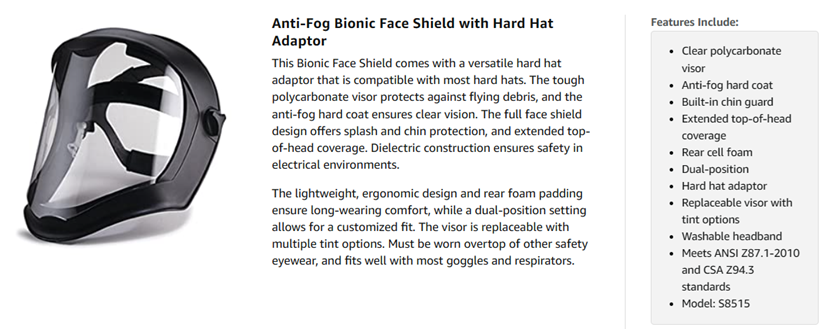| Included Components | Uvex Bionic Face Shield with Hard Had Adapter and Clear Polycarbonate Anti-Fog/Hardcoat Visor (S8515) |