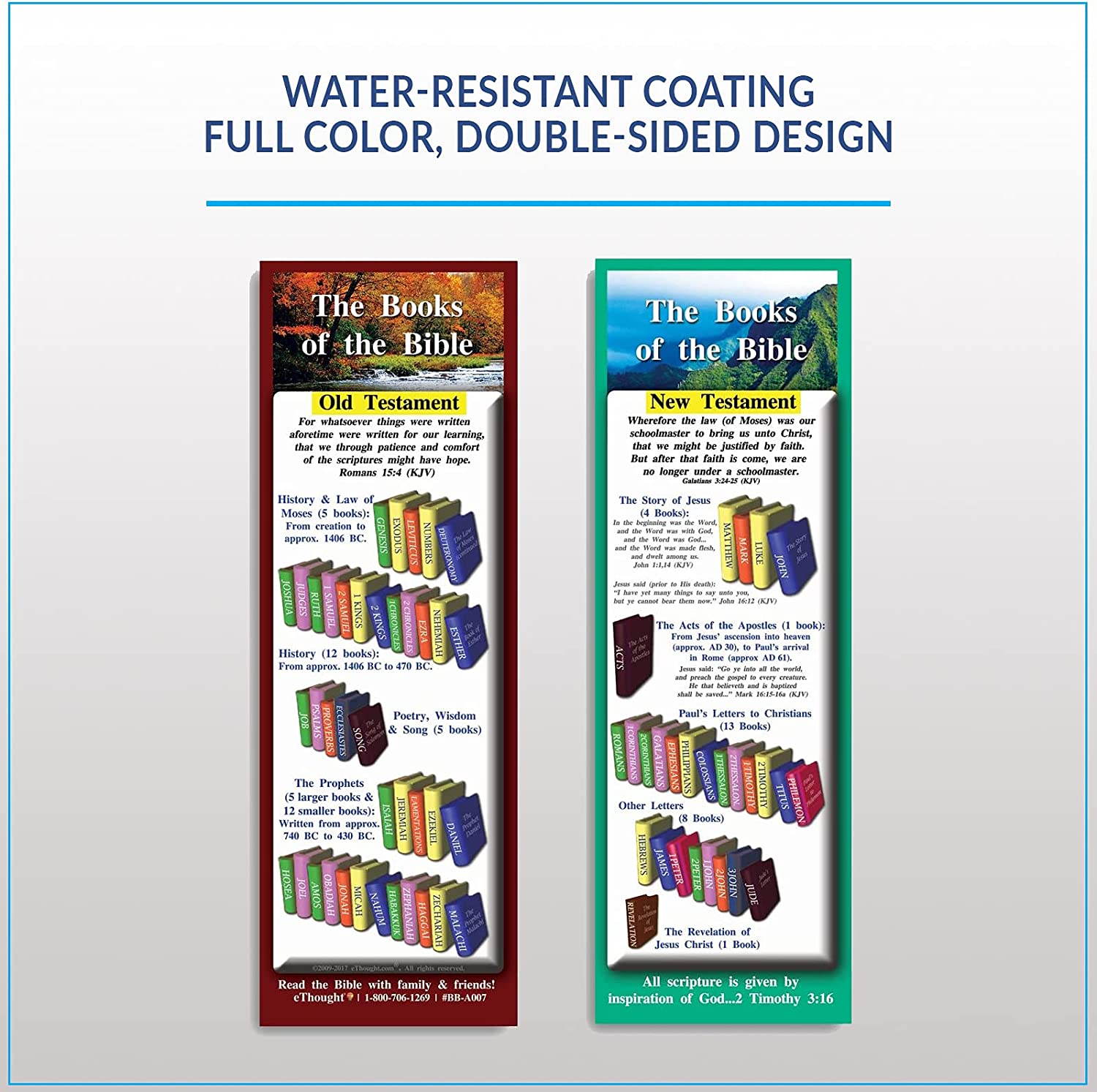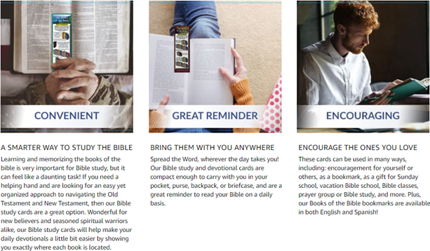 Learn the books of the Bible with our handy study guide! Learning and memorizing the books of the bible is very important for Bible study, but it can feel like a daunting task! If you need a helping hand and are looking for an easy approach to navigating the Old Testament and New Testament without any difficulty, then our Books of the Bible Bookmarks are the ideal solution. Our Bible study cards are presented in an easy-to-read format that organizes the books of the Bible by Old Testament and New Testament, and each card is double-sided and printed in full color. Great for new believers and seasoned spiritual warriors alike, our Bible study cards will help make your daily devotionals a little bit easier by showing you exactly where each book is located. Our Books of the Bible bookmarks are available in English and Spanish. Take them with you anywhere Our scripture devotional cards are compact enough to carry with you in your pocket, can be used as a bookmark, and are a great reminder to read your Bible on a daily basis. They give you the needed structure that you need so that you can rise to the challenge of studying the living Word from the beginning to the end without getting overwhelmed. Each set includes 25 individual Bible study cards that measure approximately 8.25 x 2.75 inches each. Makes a great gift for your spiritual or religious friends, family, and coworkers! Our customers use these in many ways including as handouts for morning prayer meetings, sharing of faith, encouraging Bible verse memorization, children's ministry, discipleship group, as a handy bookmark, or a gift for Sunday school, vacation Bible school, Bible classes, group study, and more. They can even be used as stocking stuffers!