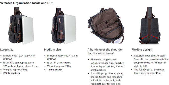 Size: 10.2*13.6*4.4 in (L*H*W). The shoulder bag can fit a slim laptop up to 13" without laptop sleeve/case. This canvas backpack is not a large backpack, but it is a great size to take to a day trip or shopping. The bag can be either carried with the hand handle or adjustable shoulder strap. Weight: approx. 810g. The full length of the strap: approx. 41in.