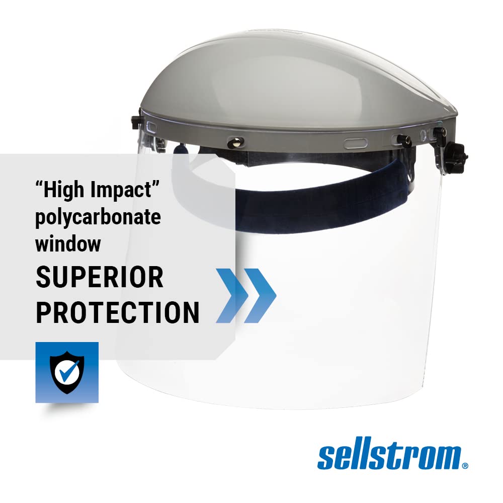 FACE SHIELD FEATURES: Includes a grey abs crown, uncoated clear polycarbonate window and ratchet headgear and pin closure. Abs injection molded crowns have universal bracket pin pattern for use with any window mount