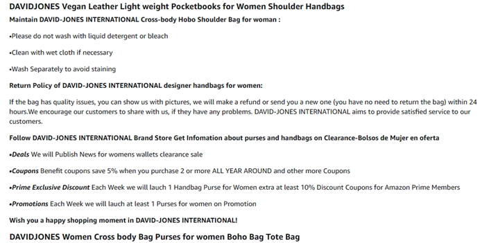 DAVIDJONES:a brand comes from Paris since 1987.Selling Handbags for Women and Girls in More than 100 countries.Great stylish and Convertible Womens Purses.Excellent craftsmanship and refined premium quality leather like PU bags.Decent high end women handbags with affordable price.