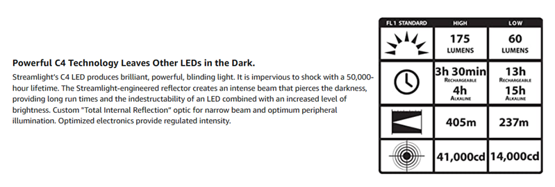• High for a super-bright beam that pierces through smoke: 41,000 candela; 175 lumens; 405m beam distance; runs 3.5 hours (NiCd); runs 4 hours (alkaline)
