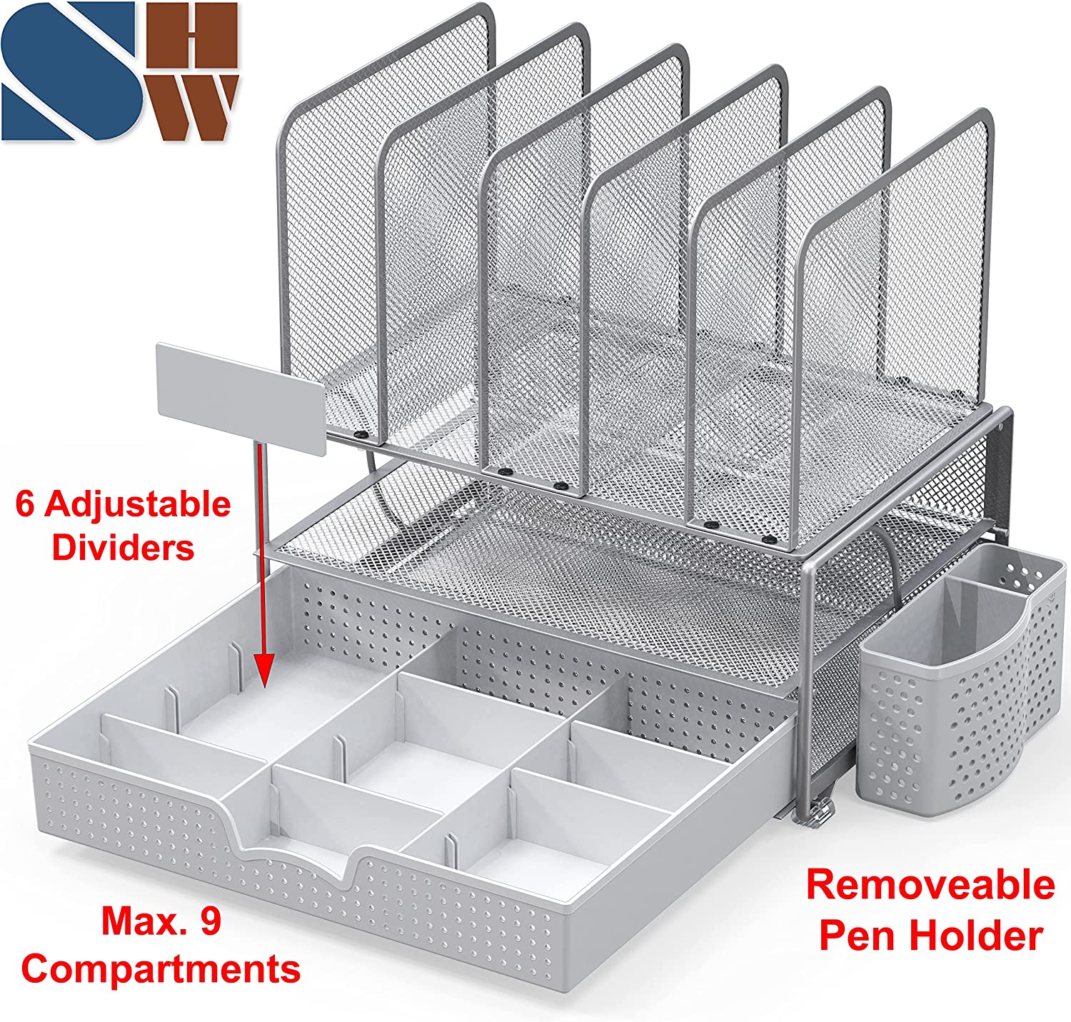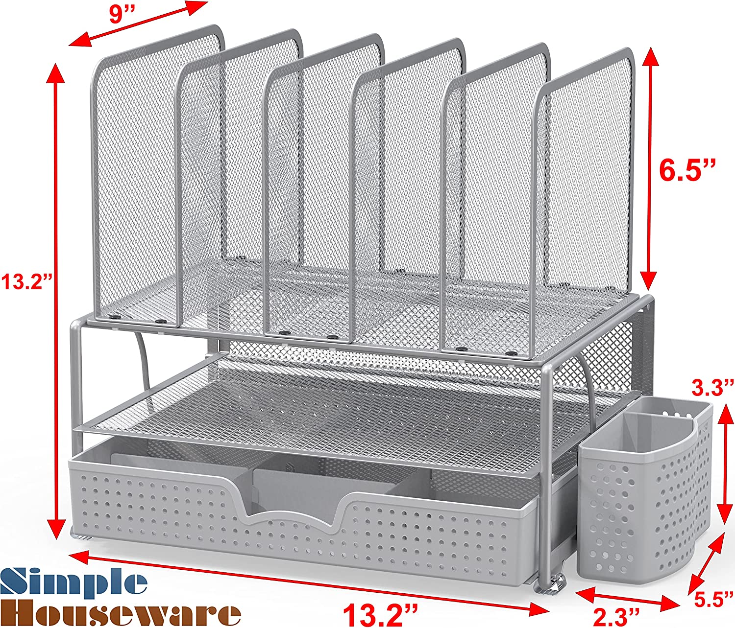 SimpleHouseware Mesh Desk Organizer with Sliding Drawer, Double Tray and 5 Upright Sections, Black
