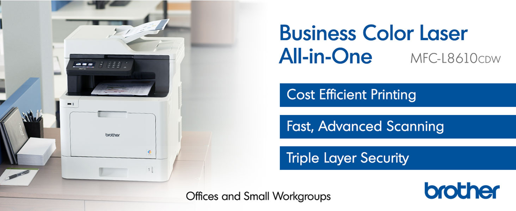 The Brother MFC-L8610CDW Color Laser All-in-One is a great choice for offices and small workgroups that need cost-efficient printing, easy scanning, secure document handling, and reliable, business-quality output. This color laser printer, copier, scanner, and fax machine was designed to enhance office productivity by delivering print speeds up to 33ppm(1) and scan speeds up to 29ipm. (6) The built-in scanning feature allows users to scan to popular destinations including e-mail, SharePoint, and business cloud services. (4) Connecting to the Brother MFC-L8610CDW is simple and convenient. Built-in wireless and Gigabit Ethernet network interfaces allow users to share the all-in-one. Plus, users can wirelessly print from a wide variety of mobile devices over a wireless network. An adjustable 3. 7″ Touchscreen display offers easy menu navigation and printing from and scanning to popular business Cloud services such as Google Drive, Dropbox, OneDrive, and more. (2) This Brother all-in-one offers a 50-page capacity automatic document feeder for copying, scanning and faxing multi-page documents. The adjustable 250-sheet capacity paper tray and 50-sheet capacity multipurpose tray make printing and copying simple. This office all-in-one can be upgraded to a 1, 050-sheet total capacity with optional trays. The MFC-L8610CDW is also Dash Replenishment enabled. This system allows the all-in-one to measure the toner level of your Genuine Brother Replacement Cartridges and automatically order replacements. This ensures you never run out of toner so that you can maintain the office efficiency you expect and require. (1)Based on one-sided printing. Change from default setting required. (2)Requires an Internet connection and an account with desired service. (3)Approximate cartridge yield in accordance with ISO/IEC 19798 (letter/A4). (4)Requires connection to a wireless network. (5)The mobile device must have NFC capability and run Android OS 4. 4 or later. (6)Scan speed measured with all advanced features turned off using LTR size test documents at 200dpi.