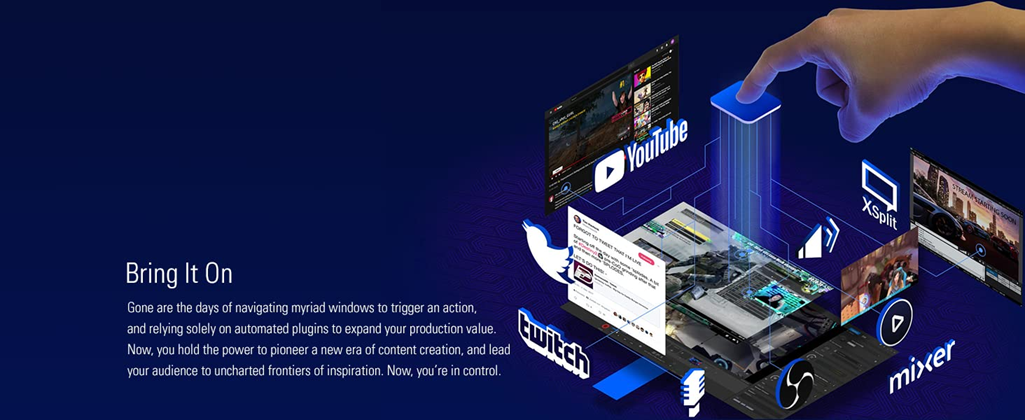 Stream Deck puts 15 LCD keys at your fingertips for ultimate studio control. Simply tap to switch scenes, launch media, tweet your feats and more. Personalize your keys with custom icons or choose from hundreds, and get visual feedback every time you execute a command. With Stream Deck, maximize your production value and focus on what matters most: Your audience. Interface Integrated USB 2.0 cable.