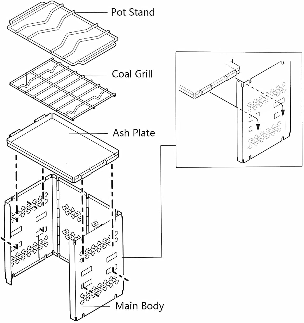 Included Components‎1 x main body, 1 x ash tray, 1 x pot stand, 1 x coal grill, 1 x storage bag