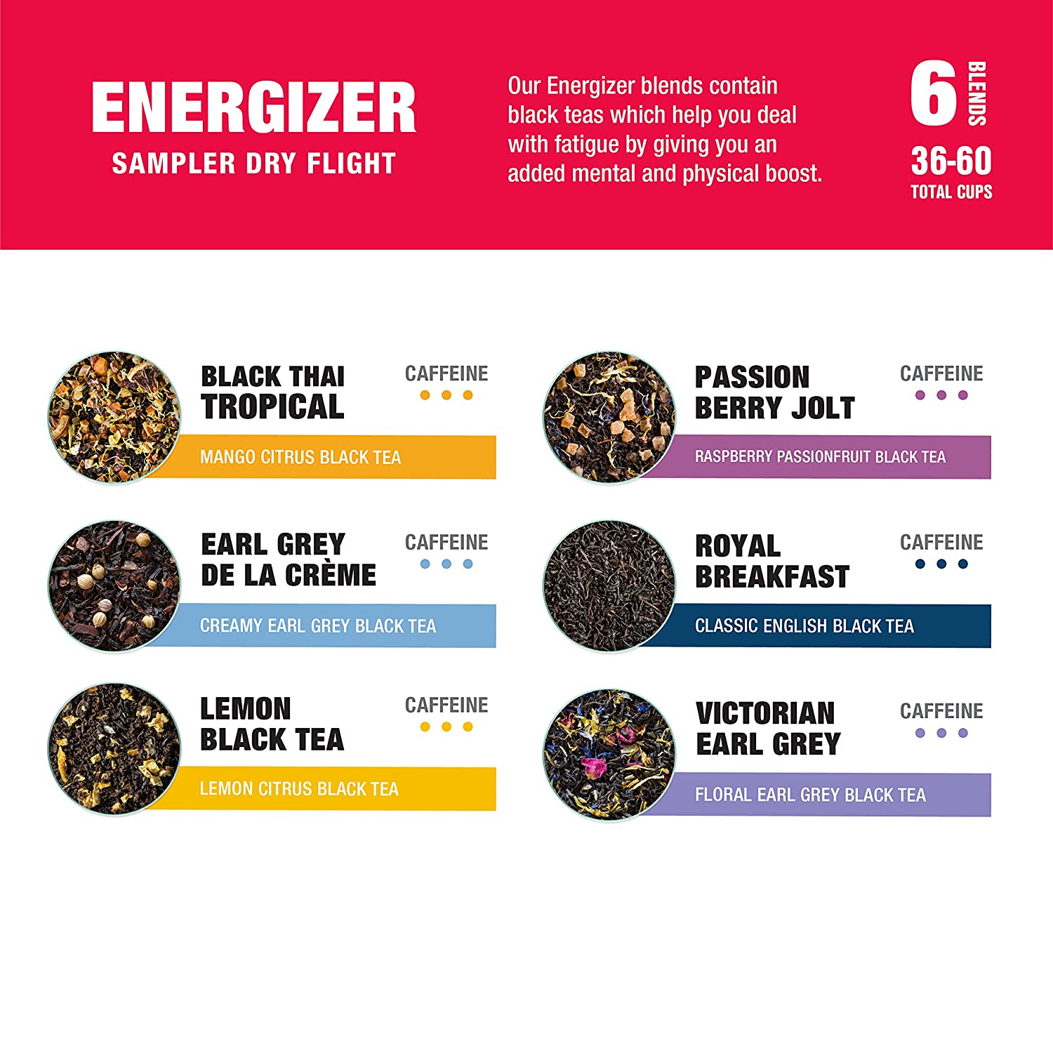 DRY FLIGHT SAMPLERS: Looking for the perfect caffeinated tea? Our Energizer Dry Flight Sampler is just what you need! Sip on 8 different caffeinated loose leaf teas from our Energizer collection and find your favorite