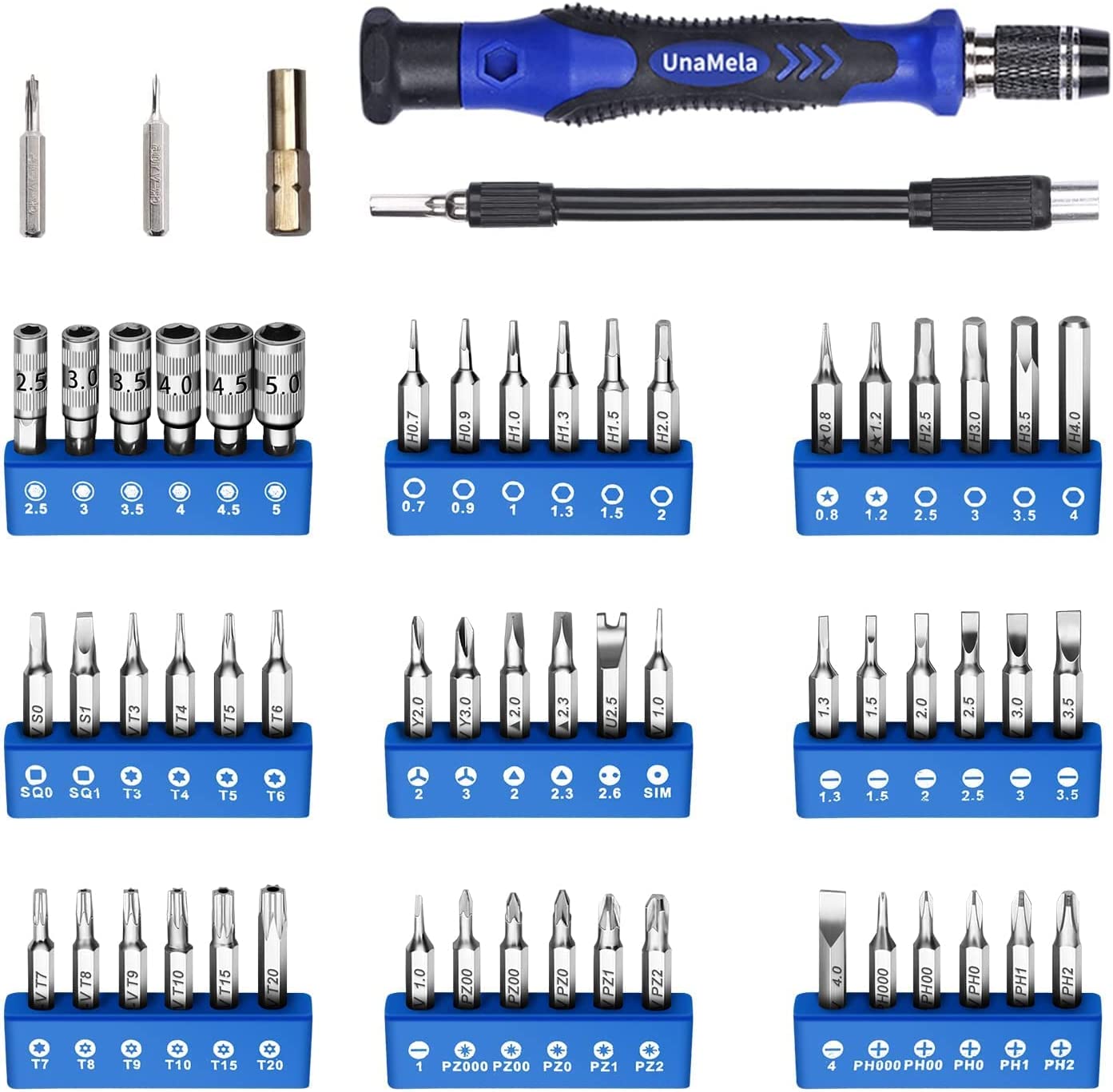 【Reliable Quality】 The 56 percision bits are CNC machined to be precise, and made of 60HRC CRV Steel which can resist abrasion, oxidation and corrosion, so the bits are sturdy, durable and not easily stripped. Each screwdriver bit (Torx, Flat, Phillips, Star, Hex, Triwing...) fits neatly into a marked slot for easy to find and storage. Flat and Phillips can use on computer, laptop, desk and other device. P2 can use to open the iPhone case. Triwing is a good helper to repair game controller.