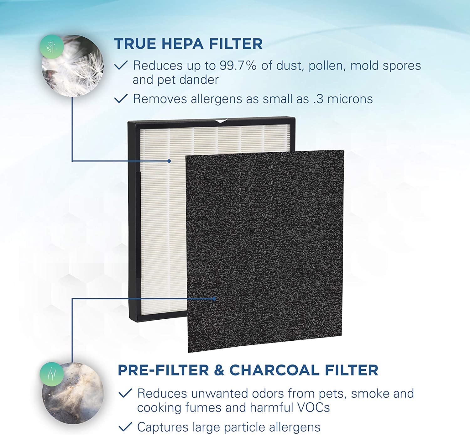 • TRUE HEPA FILTER Reduces up to 99.97% of dust, pollen, pet dander, mold spores, and allergens as small as .3 microns from the air