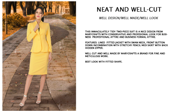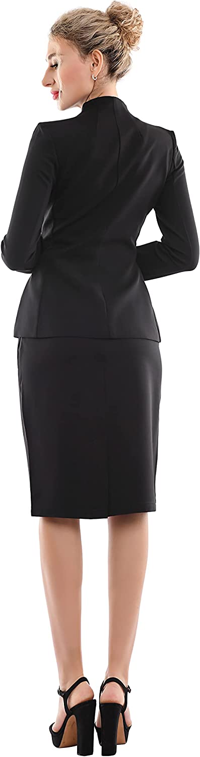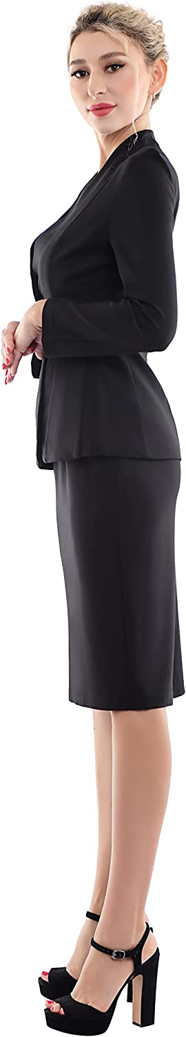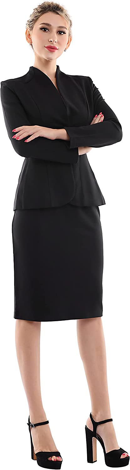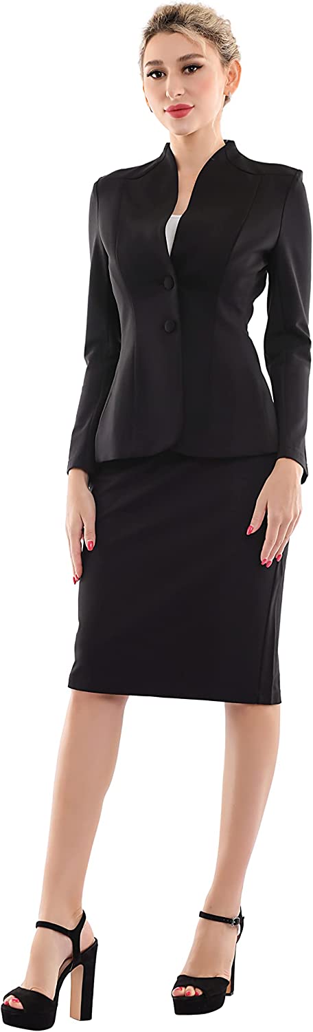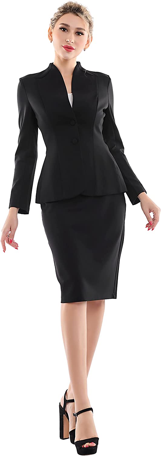 • EFFORTLESSLY ELEGANT FEATURES for successful women: with this simple design by our famous designer team, the classy top feature 2 button, color block with black, decoration waist lines, long sleeves, swan neck. The skirt features pencil sihouette, midi length. You will be confident enough to achieve successes in your career. Jacket length: 22"-25" (depends on size) Skirt Length: 29"-30" (depends on sizes)