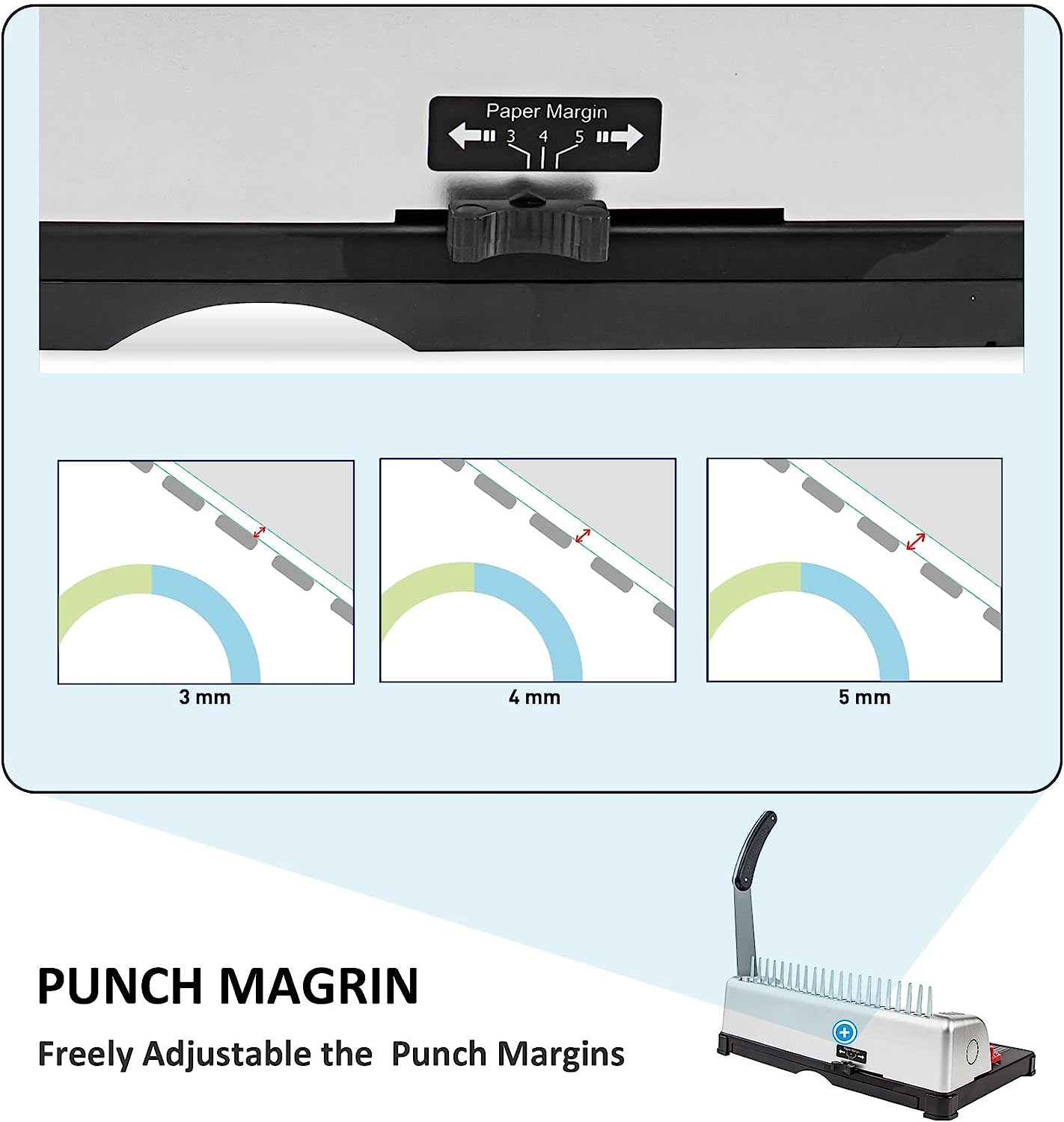 - 【Humanized Design】:TIANSE comb binding machine is suitable for Letter Size (19 holes), A4 Size (21 holes), A5 Size (15 holes). With adjustable edge guide, this machine also ensures a precise alignment with each document your bind, and you can easily customize the paper margin: 3mm, 4mm, 5mm to create professional-looking works.