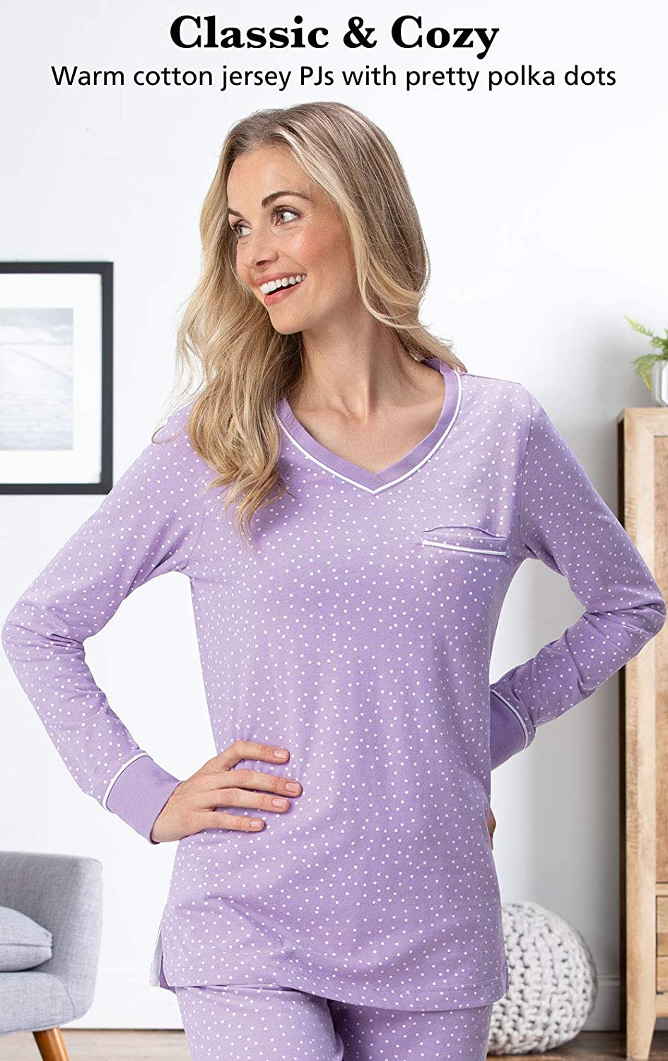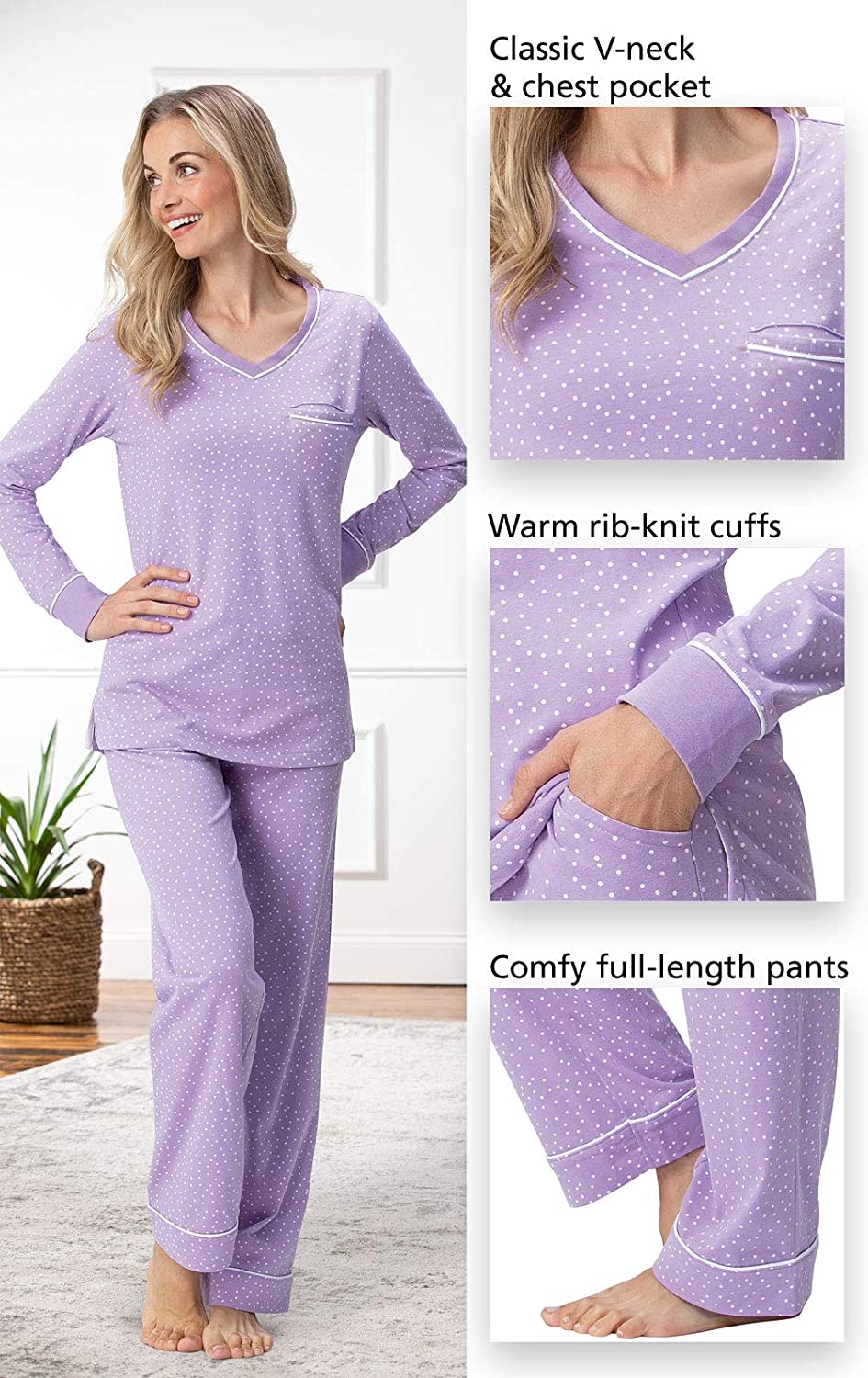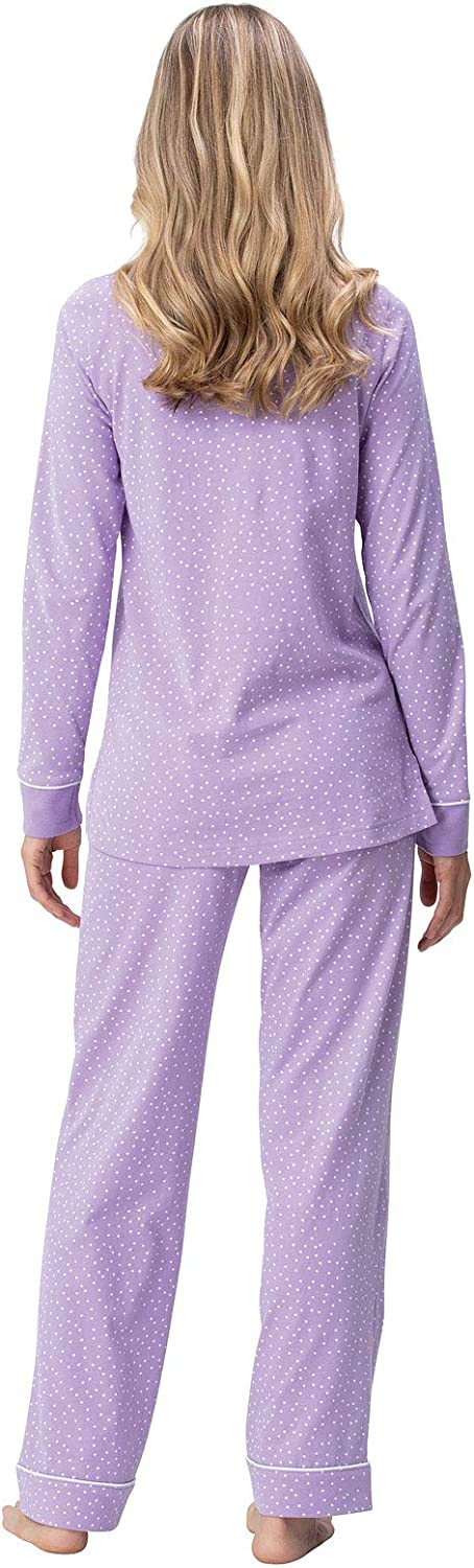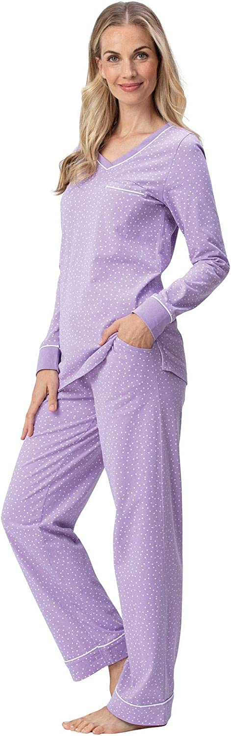 • Two-Piece Pullover PJ Set - Women's cotton pajama set features a long-sleeve v-neck shirt with rounded hem and chest pocket; matching long pajama pants with an elastic drawstring waist; pj set for women is available in our classic polka dots or rich solids, with contrast trim.