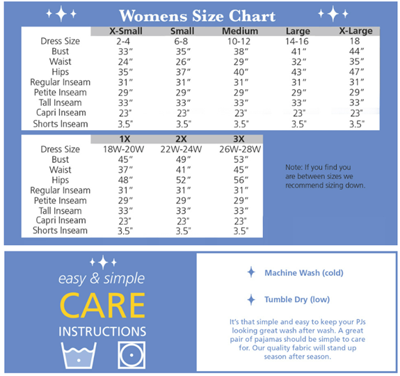 • Find the Perfect Size - Our pajamas for women have been designed by sleepwear experts to fit a range of bodies; below you will find a size chart to help you find your perfect fit.