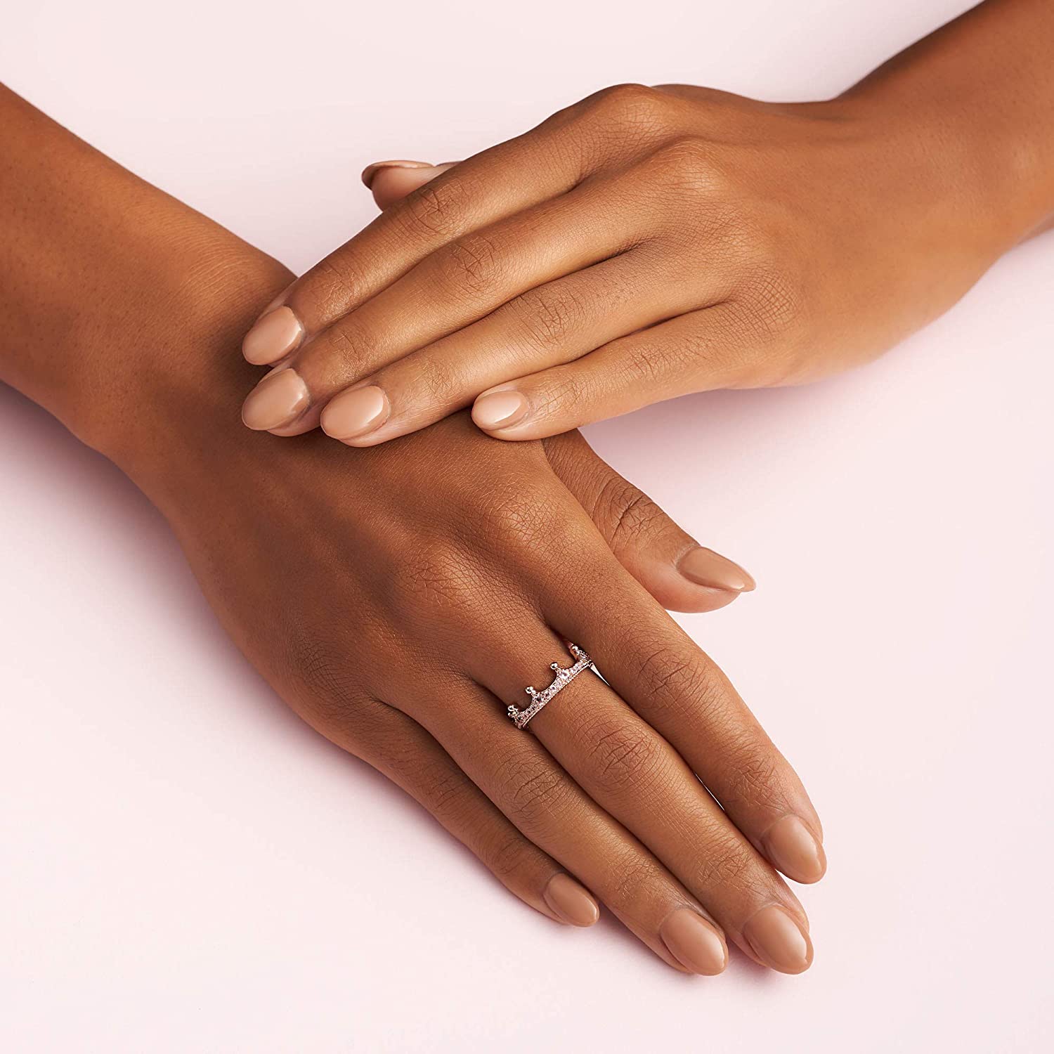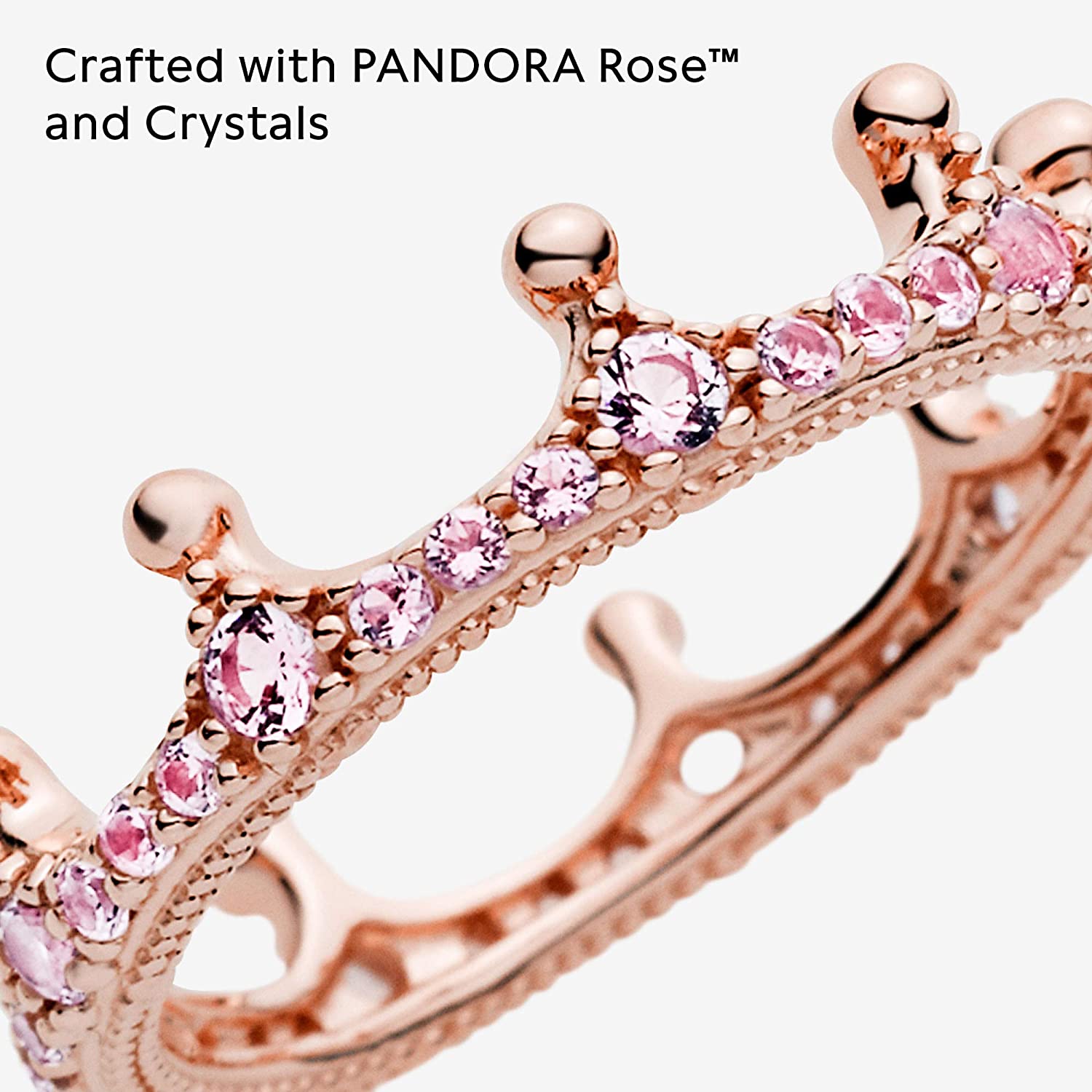 Stunning Crown Ring Design: Give your fingers the royal treatment with this pretty pink crown ring; Crafted in Pandora Rose, a 14k rose gold-plated unique metal blend, this perfect piece features a regal crown design with pink cubic zirconia stones