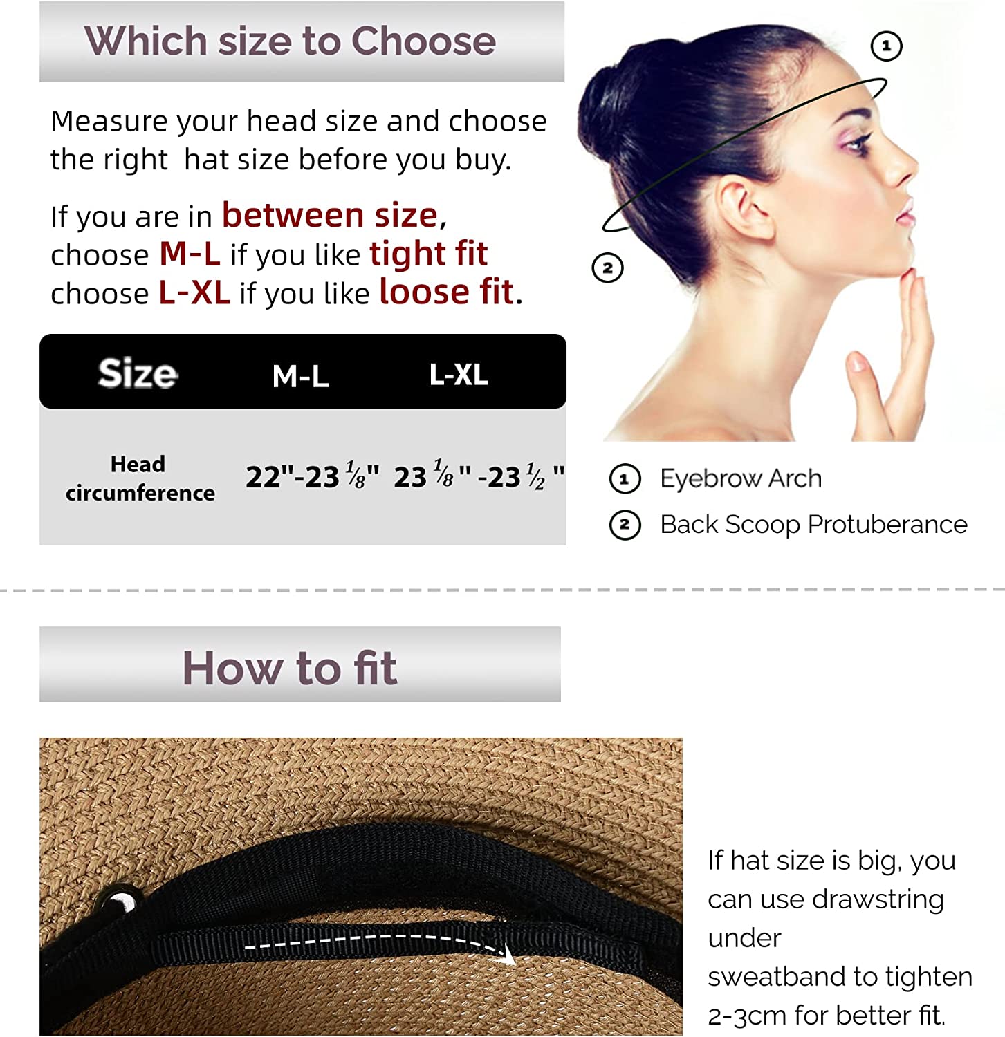 Womens Wide Brim Hat: Medium Size Hat Circumference is about 22"-23 1/8", Brim 3.2"; Large Size Hat Circumference is about 23 1/8"-23 1/2", Brim 3.2". There is an velcro strip under the inside hatband (not where it can entangle hair) that makes it size up well. Sweat absorbent inner band to help wick away moisture during the hot & humid summer seasons;