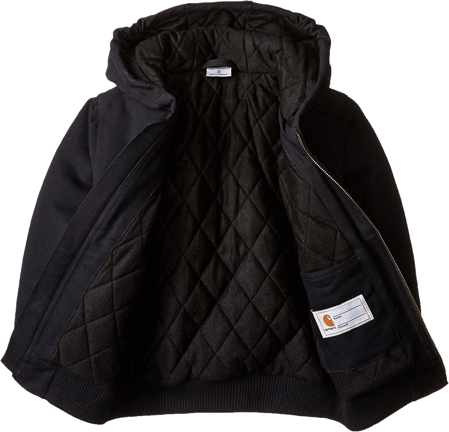 Duck jacket with quilted brushed tricot lining, triple-stitched seams, front pockets, rib cuffs and bottom hem quilted taffeta lining in sleeves leather carhartt brandmark label