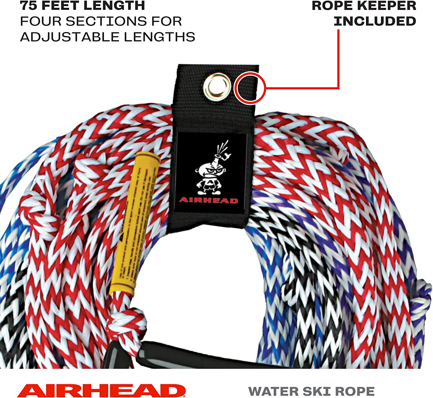 Performance Water Ski Rope This 75 foot long rope has 4 sections (75',60',50',40') to meet the needs of skiers and riders of all skill levels. The 12" aluminum core handle has a performance Tractor grip and full-length molded finger protectors. You'll love the candy stripe color scheme of the UV-treated 16-strand 1,600 lb. tensile strength rope. A Rope Keeper is included for tangle-free storage.