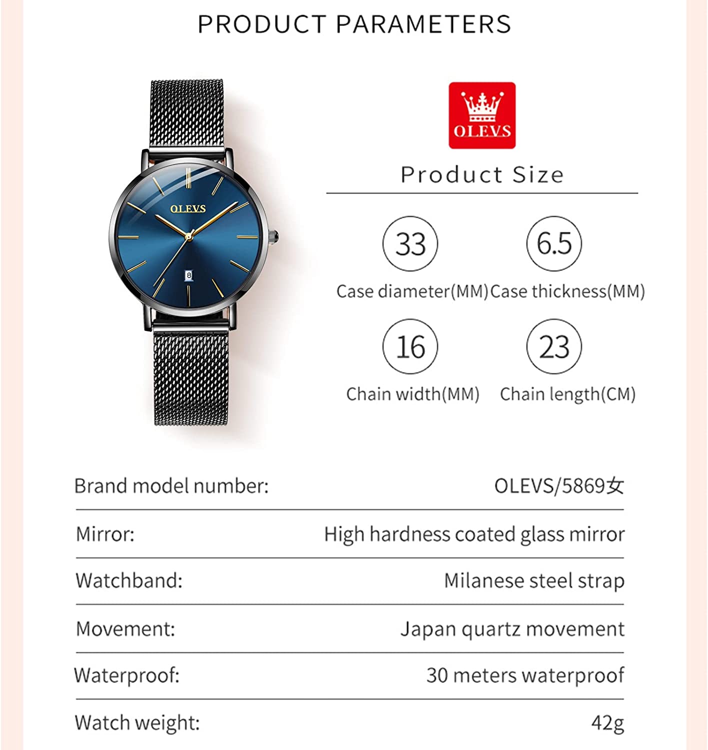 • 【WHAT YOU GET】?We Will Put The OLEVS Watch Perfectly in a Beautiful Gift Box and Deliver It to You In a Sturdy Package.Believe That OLEVS Watches will Be Your Favorite Gifts for You or Your Friends and Loved Ones.You Can Get. Package: 1 x Women Watches; 1 x Watch Box; 1 x User Manual