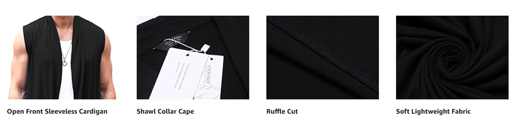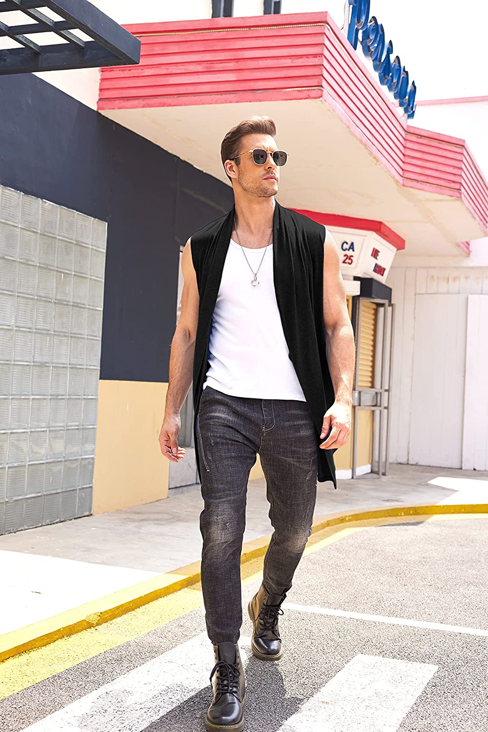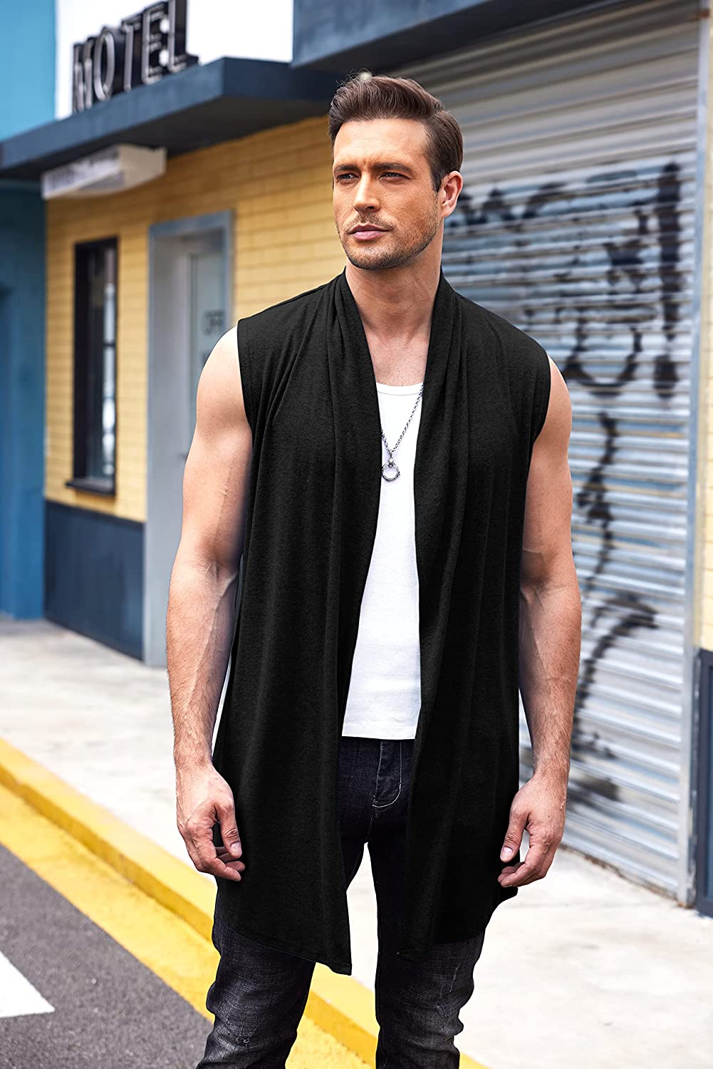 COOFANDY Men's Ruffle Shawl Collar Cardigan Sleeveless Open Front Vest Lightweight Long Length Drape Cape