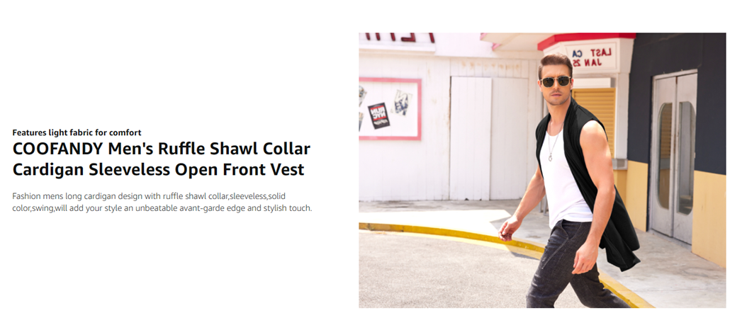 • Fashion mens long cardigan design with ruffle shawl collar,sleeveless,solid color,swing,will add your style an unbeatable avant-garde edge and stylish touch.