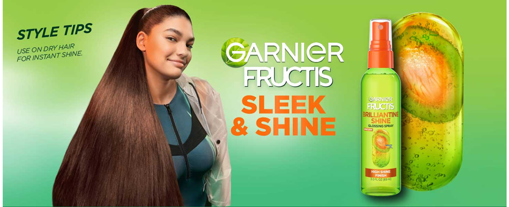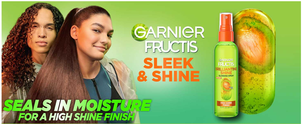 • Garnier Fructis Style Brilliantine Shine Glossing Spray made with fruit micro waxes seals shine and moisture into hair