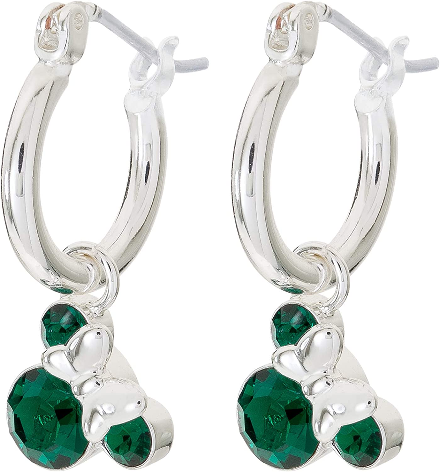 Disney Minnie Mouse Jewelry, Crystal Birthstone Silver Plated Hoop Dangle Earrings, Latch Back