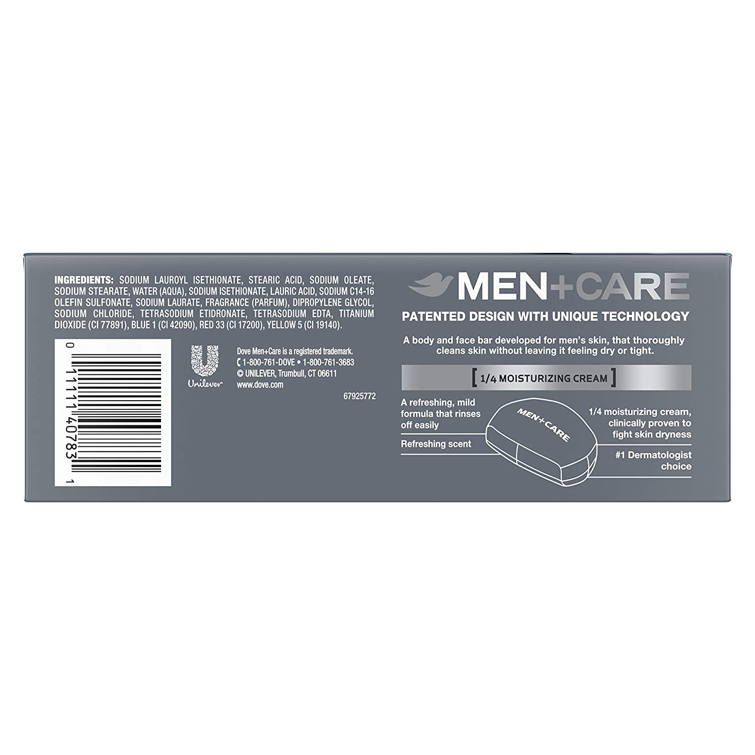 Looking for a men's bar soap that will thoroughly clean your skin and leave it feeling hydrated, cool, and comfortable? Treat your skin every day with the mild but effective formula of Dove Men+Care Clean Comfort Body and Face Bar. More than just a regular men's bar soap, this bar from the #1 Dermatologist Recommended Men's Brand has a formula that cleanses your skin and delivers refreshment and skin comfort. This body bar is part of the Dove Clean Comfort range and unlike regular bar soap for men which can dry your skin out, the Dove Men+Care bar contains 1/4 moisturizing cream that helps maintain skin's hydration and moisture levels, while also delivering a refreshing clean. Dove Men+Care understands the importance of having a simple daily routine for caring for your skin. This Dove Clean Comfort Body and Face Bar is noncomedogenic and can be used across your whole body to gently clean skin and is even mild enough for use on your face. In the shower, simply wet the Dove Men+Care bar and rub it between your hands to produce a light foam lather before working it over your skin and rinsing thoroughly. The creamy foam rinses away easily and the non-greasy foaming lather will provide a comfortable, refreshing clean.