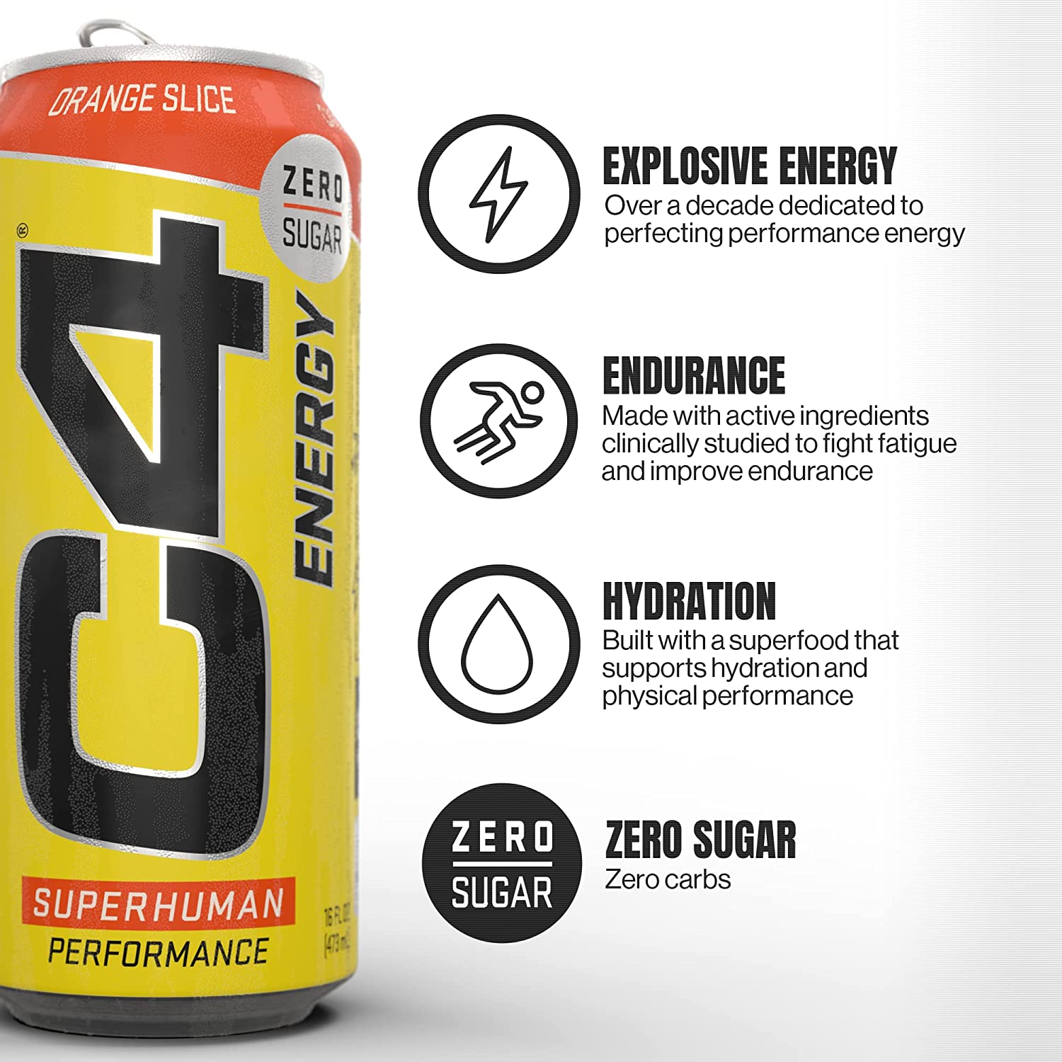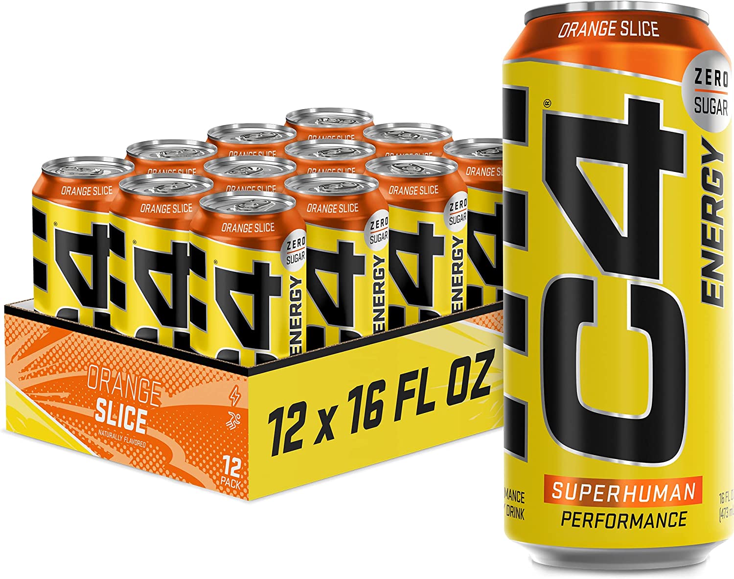 C4 Energy Carbonated Zero Sugar Energy Drink, Pre Workout Drink + Beta Alanine, Orange Slice, 16 Fl Oz (Pack of 12)
